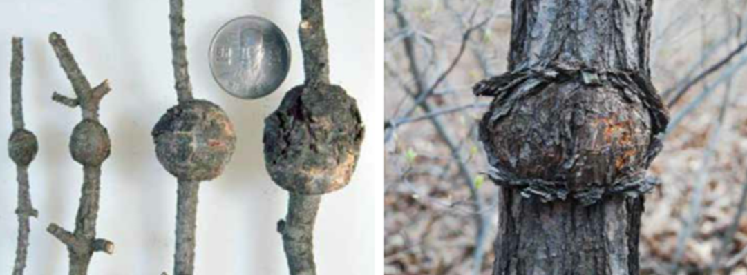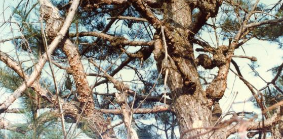 소나무혹병의 병원체는 Cronatium quercuum 입니다. 소나무혹병 진단의 특성과 소나무혹병의 생활사는 겨울포자가 9~10월 발아하여 담자포자를 형성하며 담자포자는 당년에 자란 소나무, 곰솔의 어린 가지에 침입한 후 약 10개월간의 잠복기간을 거쳐 이듬해 여름부터 가을에 혹을 형성합니다. 소나무혹병균에 의해 발생된 혹은 비대하여 30cm 이상이 되기도 합니다. 5~6월에 중간기주인 참나무류 잎뒷면에서 여름포자가 형성되고 7월 이후에는 짧고 긴 갈색의 겨울포자퇴가 뒷면에 형성됩니다.