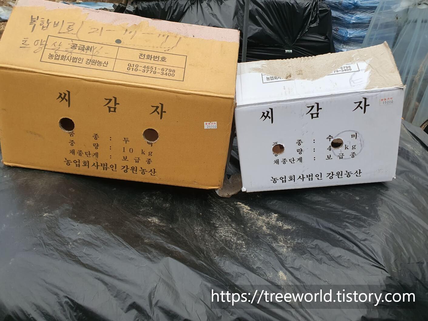 씨감자 자르기 및 감자심기에 앞서 원하는 감자의 종류를 선정해야 합니다. 올해는 씨감자로 두백을 선정하였습니다. 수미감자는 요리용으로 두백은 쪄먹는 감자로 주로 사용되는 종류입니다. 두백은 분이 많아 구워 먹거나 쪄먹는데 맞는 종류입니다. 다음은 감자를 심기 전에 심을 땅에 적당한량의 씨감자를 구매하여야 합니다. 통상 씨감자는 100㎡(30평 정도)에 10kg이 적당한 량입니다. 저는 150㎡(45평 정도)에 14kg의 씨감자를 구매하였습니다.