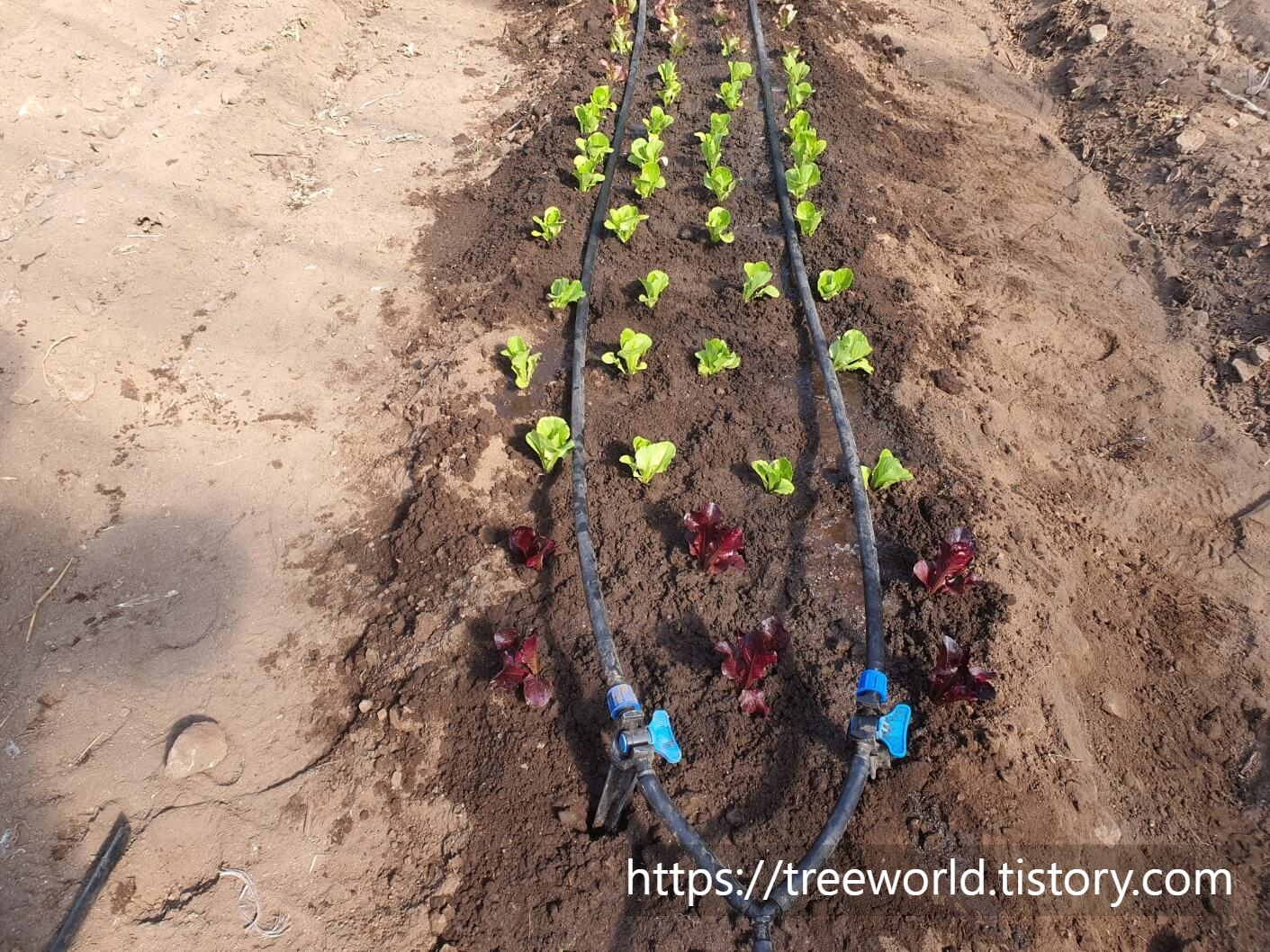 상추 모종을 심고 나면 물 주기 다시 해야 합니다. 물을 충분히 주어야 합니다. 조금뿌리면 표면수가 되어 흘러내립니다. 땅속까지 물이 스며들게 하려면 천천히 조금씩 오래 주어야 하는데 농촌에서는 그래서 점적관수관을 깔아서 한 방울씩 하루종일 물이 떨어지게 합니다.