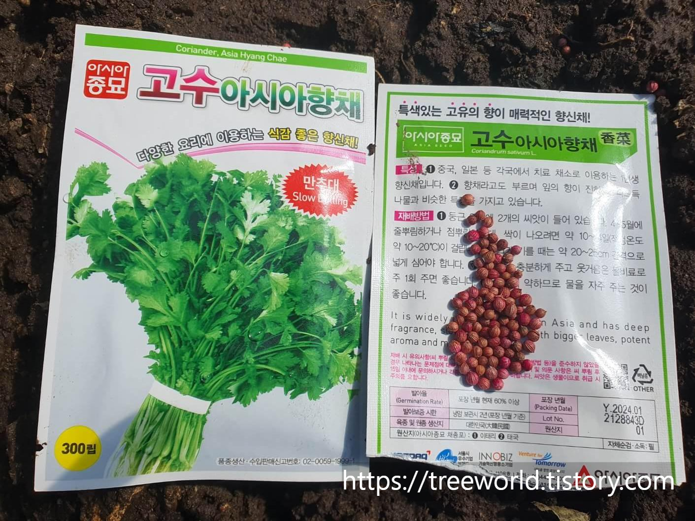 너무 깊이 심으면 발아해서 새싹이 올라오기가 어렵고 너무 앝게 심으면 땅이 너무 빨리 마르기 때문에 위조증상(물부족현상)으로 어린싹이 바로 죽을 수 있습니다. 고수씨앗은 생각보다 매우 크므로 점파종을 해야 합니다.