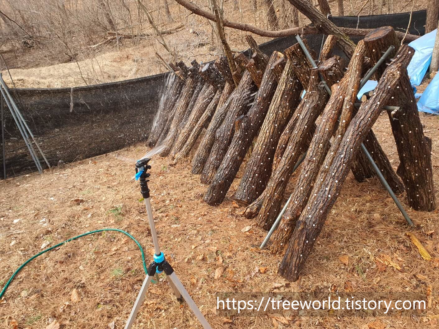 봄철 표고버섯 재배하는 방법에 대하여 알아보겠습니다 가장 우선은 봄철 표고목 관리부터 시작합니다. 봄철 표고버섯 재배는 가을철에 비해 성장속도가 매우 느리고 또 버섯이 자라는 모습도 많이 다릅니다. 올해 봄철 표고버섯 재배는 먼저 표고목 세우기부터 시작하였습니다. 2월 말에서 3월 초까지 겨우내 누워있던 표고목 세우기를 하였습니다. 그리고 망치로 쳐서 잠자는 포자 깨우기를 하였습니다. 봄철 표고버섯 재배는 적당한 시기에 물을 주어야 합니다. 2주 간격으로 물 주기를 하되 한번 줄 때는 3~4시간 이상 충분히 주어야 합니다.