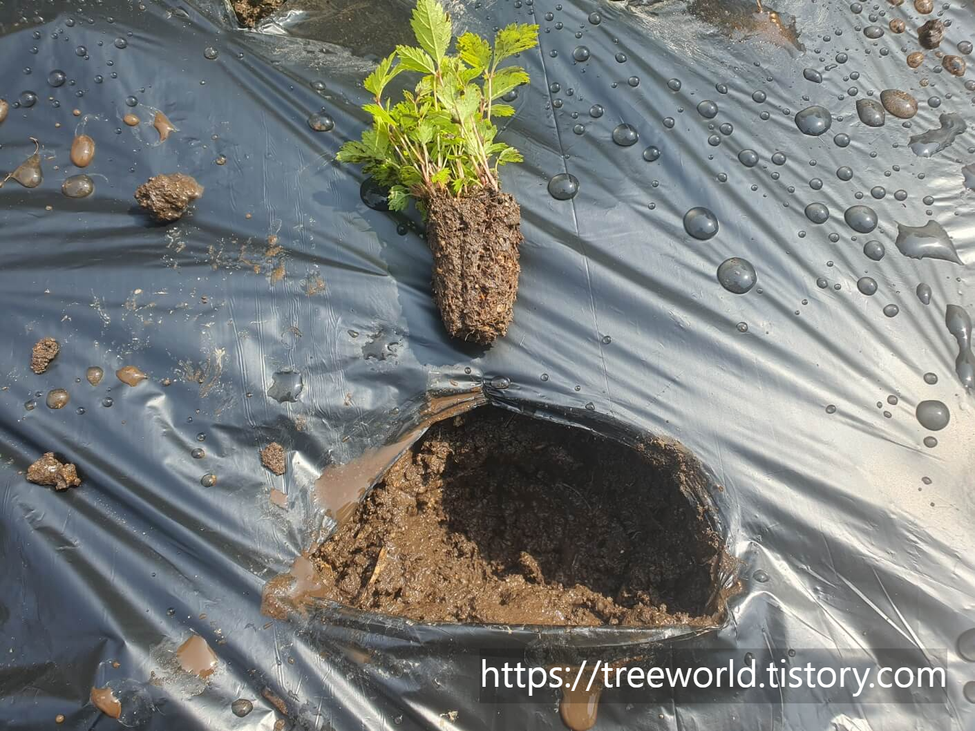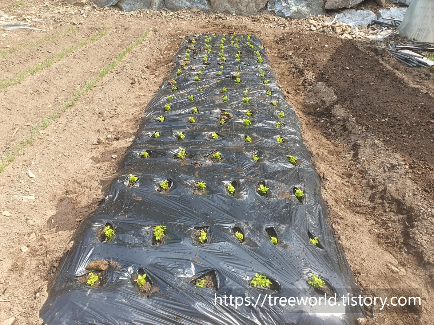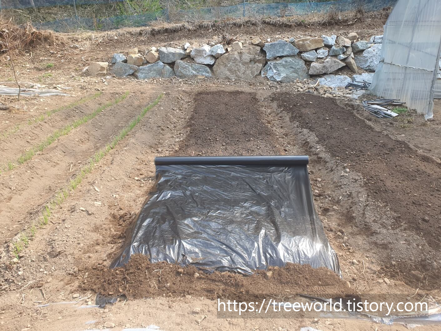 눈개승마 모종 심는 방법에 대하여 알아보겠습니다. 눈개승마 모종을 심기 위해서 고랑 이를 넓게 하여 150cm 폭의 비닐로 피복하였습니다. 관리기로 고랑 만들기를 하지 않고 트랙터로 로터리만 치고 고랑넓이는 제가 수작업으로 하였습니다. 물론 비닐피복을 하지 않아도 됩니다. 그러나 여름에 잡초제거가 힘들어 피복하였고 비닐피복 전에 고랑에 충분한 물을 주어야 합니다. 비빌피복을 하면 수분이 잘빠져 나가지 않기 때문에 한번 물을 많이 주면 오랫동안 수분이 유지됩니다.