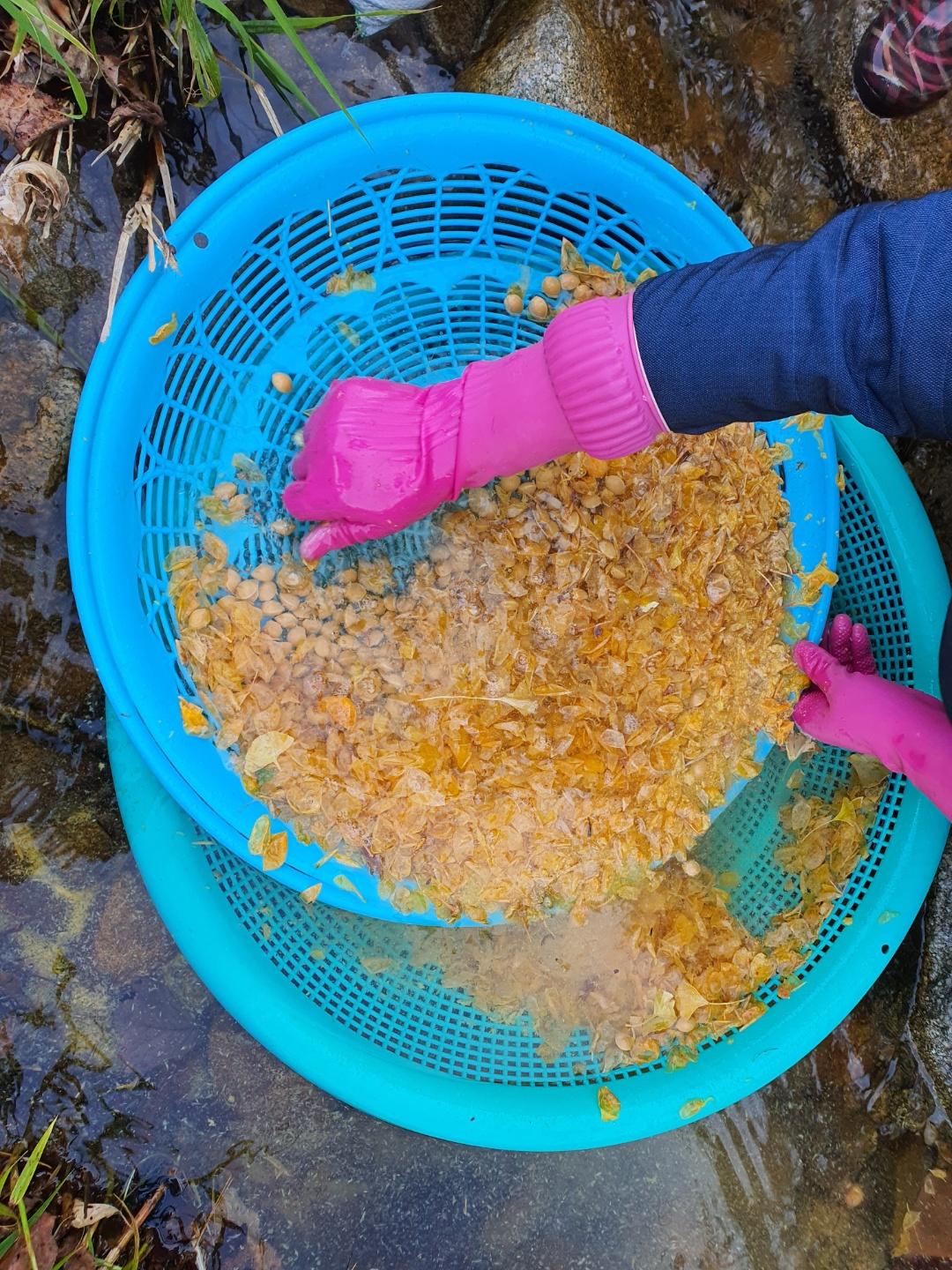 집앞 냇가에서 양파망이나 쌀자루에 넣어서 발로 으깨어서 죽을 만든다음 그것을 물에 잘행구어야 하나하나의 은행열매가 나타나기 시작 합니다. 덜 으깨어진것은 손으로 으깨가면서 걸러야 생산이 되고 또 시냇물이 없으면 하기가 매우 어렵습니다. 흐르는 물에 여러번 씻으면 이제 우리가 평소보던 그런 은행이 나타납니다.