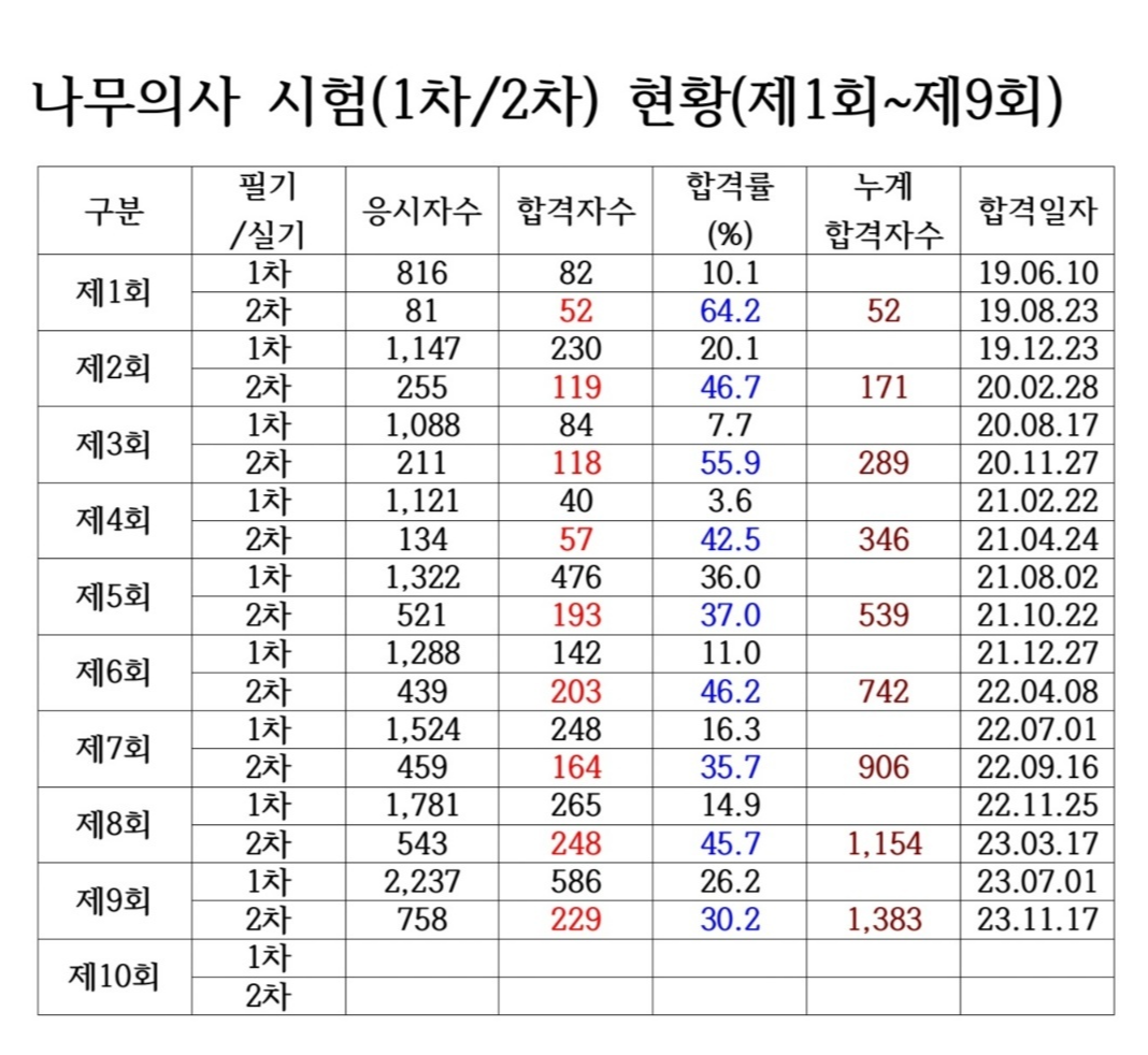 현재 9회 자격시험까지 나무의사 합격자수는 1,383명입니다. 향후 매년 200명 정도씩 최종합격자가 배출될 것 같은 전망입니다. 년 1회 시험을 치르니 적당한 관리가 아닌가 생각됩니다.