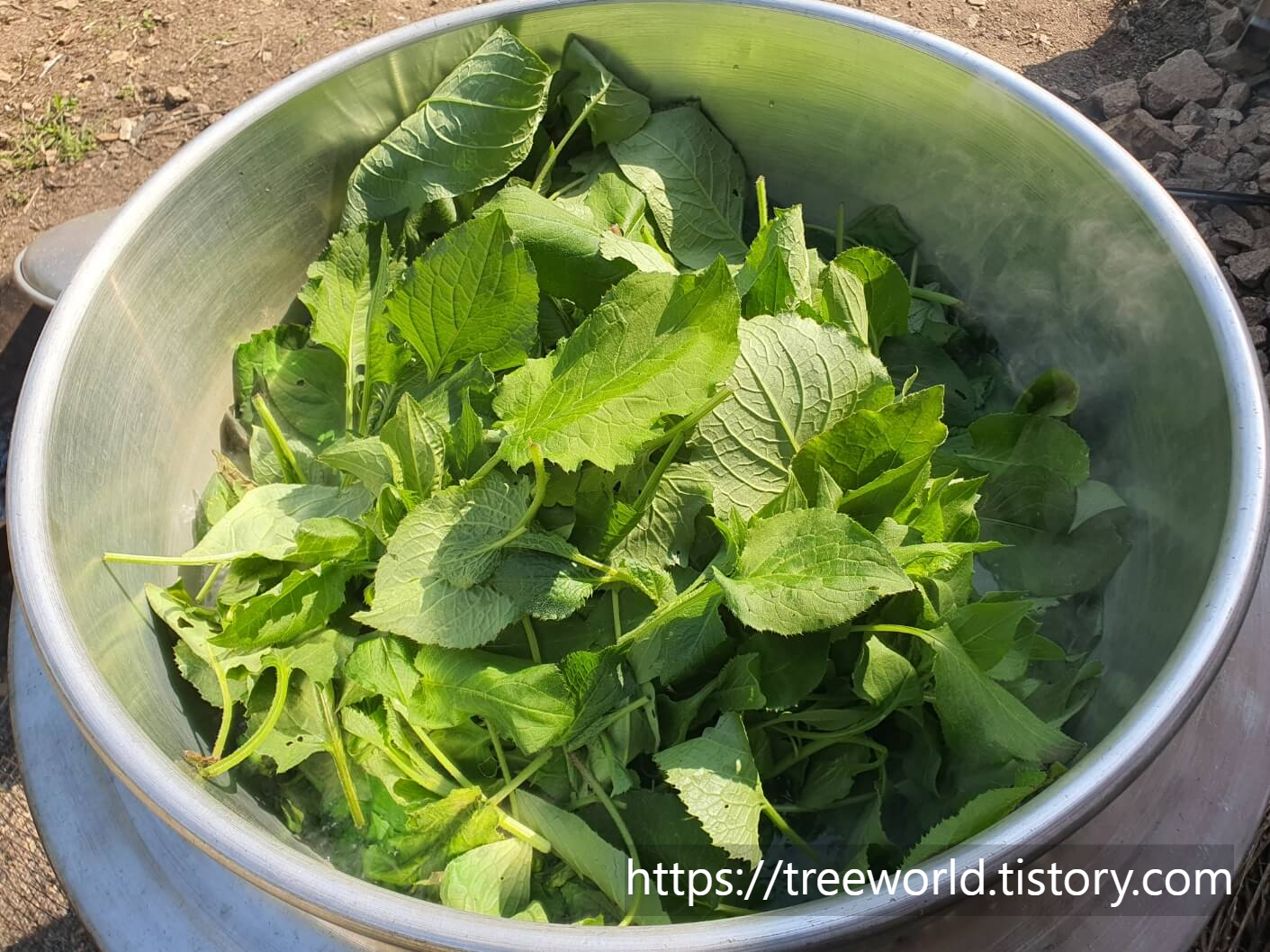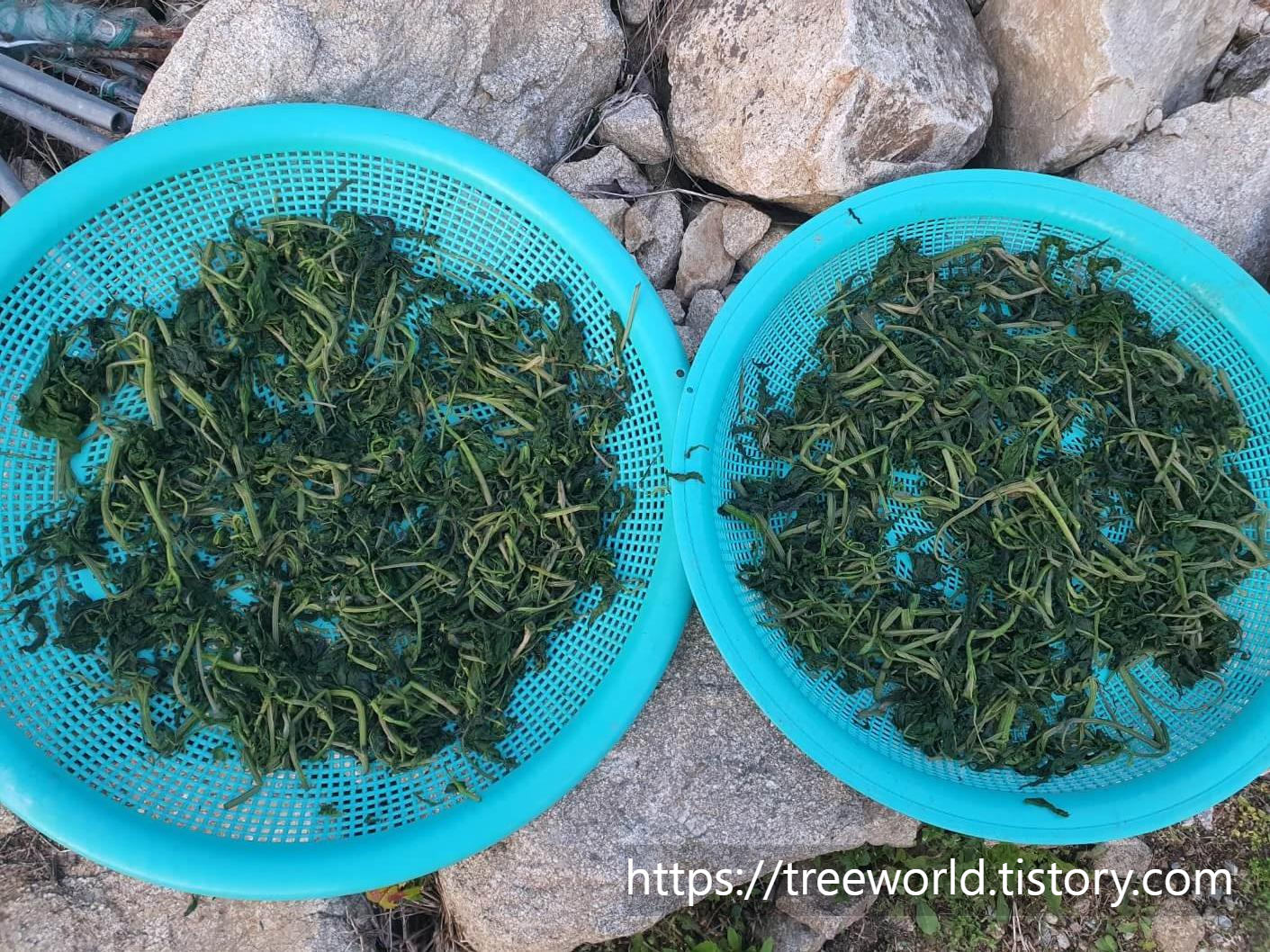 곤드레 채취후 삶는 방법입니다. 먼저 가마솥에 물이 충분히 넣고 끓인 다음 채취한 곤드레를 넣어서 밟아야 합니다. 삶을 때 시간이 중요합니다. 통상 한소끔 끓인다고 하는데 이기준은 애매합니다. 끓는 물에 채취한 곤드레를 넣고 다시 물이 끓어야 합니다. 삶은 곤드레가 잘 익었는지 확인하는 방법은 큰 대공을 손톱으로 눌러보았을 때 손톱이 들어가서 끊어지면 다 삶아진 것입니다. 끓는 물에 채취한 곤드레를 넣을 때도 대공을 먼저 넣어야 합니다. 다 삶아지면 건져서 찬물에 옮겨야 합니다. 찬물에서 깨끗하게 세척을 한 다음 햇볕에 말려야 합니다.