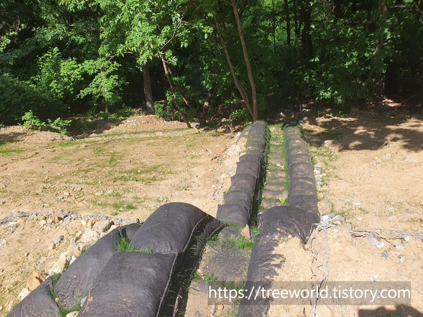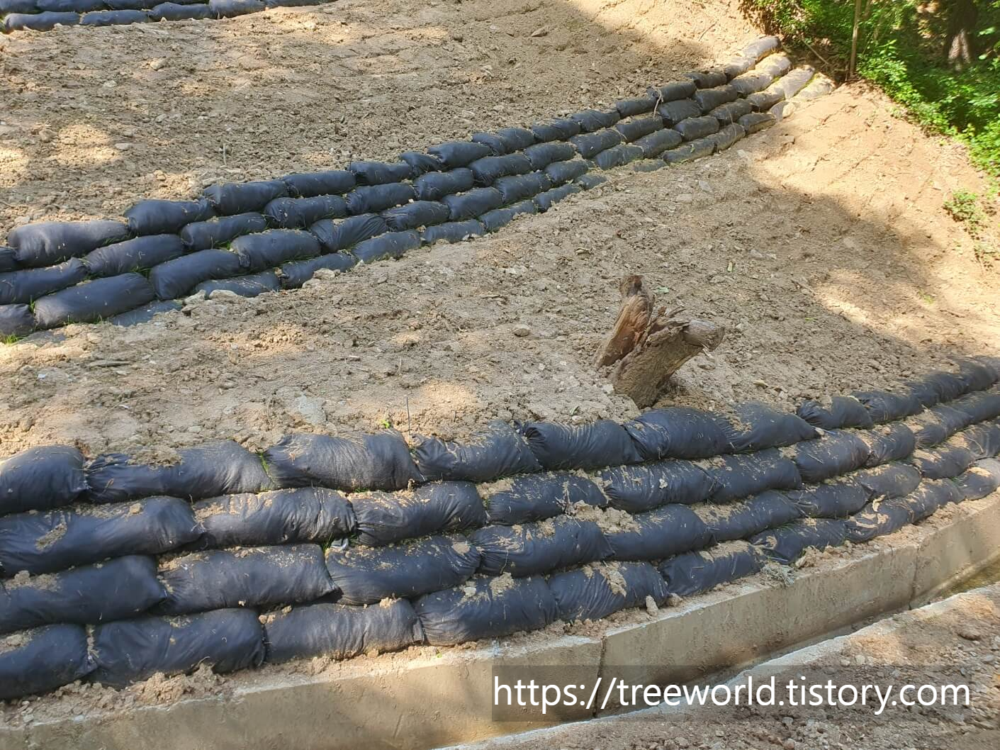 사방사업은 경사가 심한 계곡이나 산에서 자갈, 모래, 바위등의 이동으로 인한 산사태를 막기 위하여 실시하는 사업입니다. 사방사업에는 여러 가지 공정이 있겠지만 산사태예방이나 산사태 복구사업 때 많이 활용되는 아주 손쉬운 공법 입니다. 무너진 곳이나 위험이 있는 곳에 식생토낭을 쌓아서 더 이상 사태가 확대되는 것을 막을 수 있고 물흐름의 방향을 바꾸거나 무너진 곳을 응급복구하는 등에 가장 많이 사용되는 사방공법이 식생토낭 쌓기입니다.