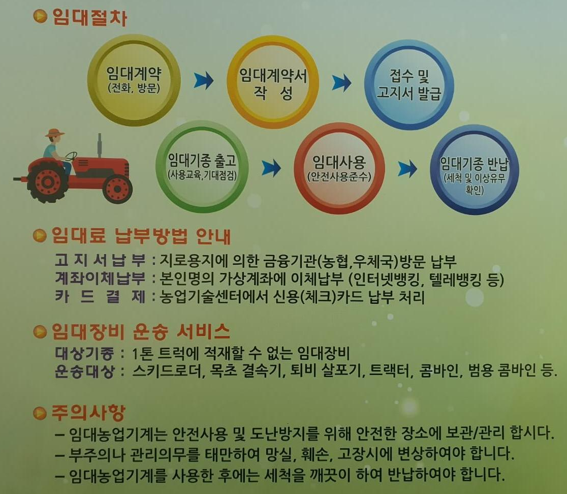 농기계 임대사용 절차는 농업기계안전교육 교육을 이수하고 농업경영체등록증이나 농지원부, 주민등록증 등으로 본인확인하고 임대계약서 작성후 사용료를 입금하시면 사용가능합니다. 물론 농기계 임대사용 절차는 전화로 가능합니다. 나머지 서류는 기계 가지러 농업기술센터로 갈 때 제출하시면 됩니다. 또 기계사용법은 기계출고 후 상세히 알려주니 걱정 안 해도 됩니다. 문제는 임대장비 운송서비스가 좋지 않습니다. 트랙터, 콤바인, 퇴비살포기 등 대형장비는 운송 서비스를 합니다. 약 5만 원 정도 합니다. 그런데 1톤 터럭에 적재가능한 장비는 본인이 알아서 운송해야 합니다. 저는 트럭이 없어 주변에서 빌려서 관리기를 싣고 왔습니다. 상하자용 사다리는 무료로 빌려줍니다.