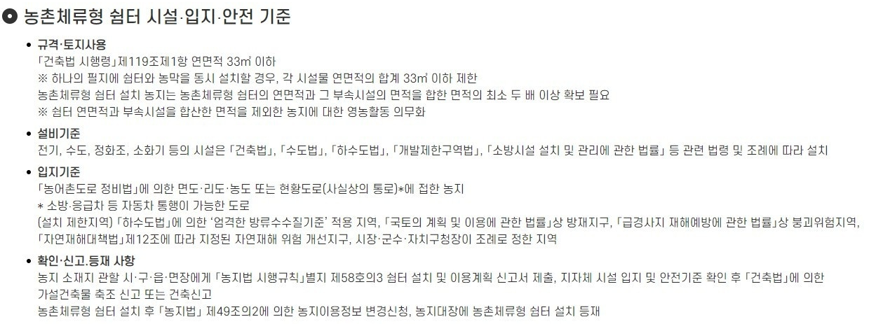 농촌체류형 쉼터의 설치기준의 아래의 내용을 참조하시면 됩니다.