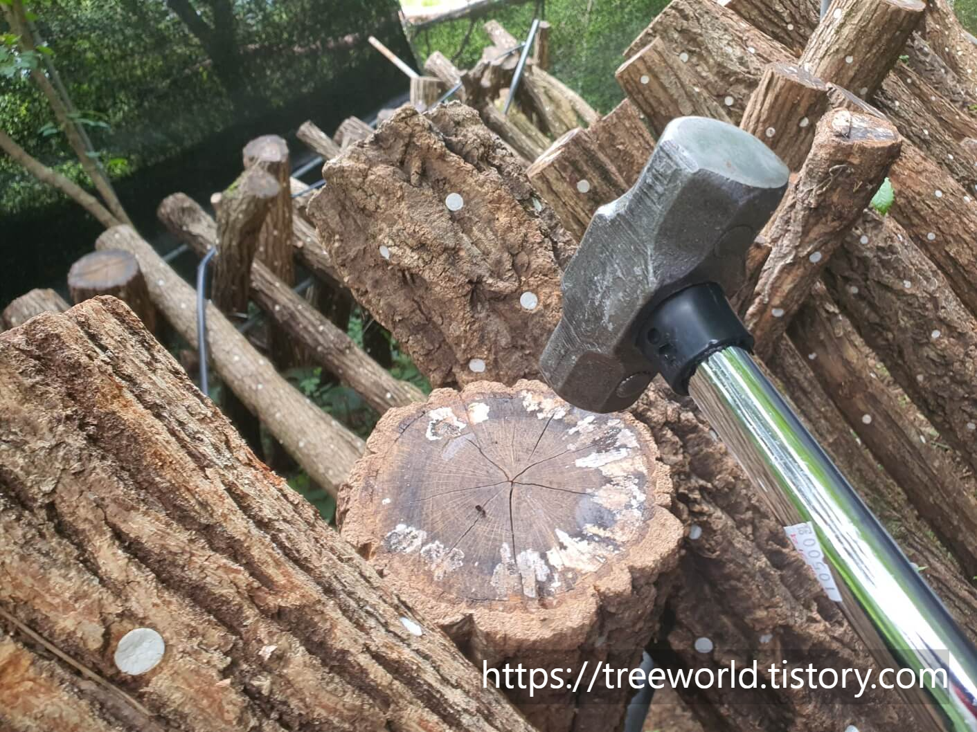 표고버섯 원목세우기는 통상 7~8월에 실시됩니다. 원목 세우기가 끝나면 물 주기 방법도 변해야 합니다. 물론 장마철이다 보니 기상을 고려하여야 하고 또 기온이 높으므로 이내 원목의 수분이 마르기 때문에 주 1회 5시간 이상은 물 주기를 하여야 합니다. 그리고 8월 초가 되면 종균 깨우기를 하여야 합니다. 종균 깨우기는 망치로 원목을 쳐야 합니다. 1회성으로 끝나면 안 되고 2주간에 걸쳐서 2~3회 정도 실시 하여야 합니다.
