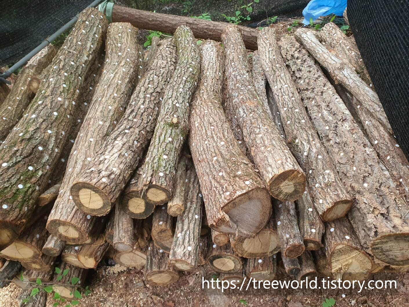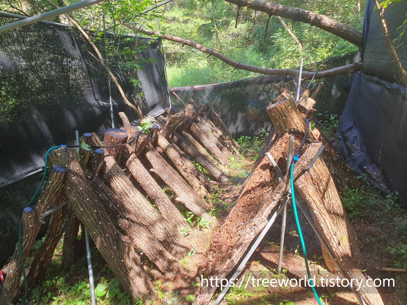표고버섯 원목 물주기는 점적관수 이용하되 위쪽으로 바늘로 구멍을 내면 수압에 의해 물이 위로 올라가서 연무 형태로 떨어집니다. 이런 방법으로 장시간 물 주기를 하면 빈 곳이 없이 전체적으로 물 주기를 할 수 있습니다. 그래서 저는 점적관수관에 위쪽 구멍을 많이 내서 물 주기를 합니다. 안개처럼 물이 내려오는 것이 원목의 표면에 많은 수분을 공급해 줍니다. 그리고 표고버섯은 햇볕에 말리면 영양소가 훨씬 높아진다는 사실 참고 하십시오.