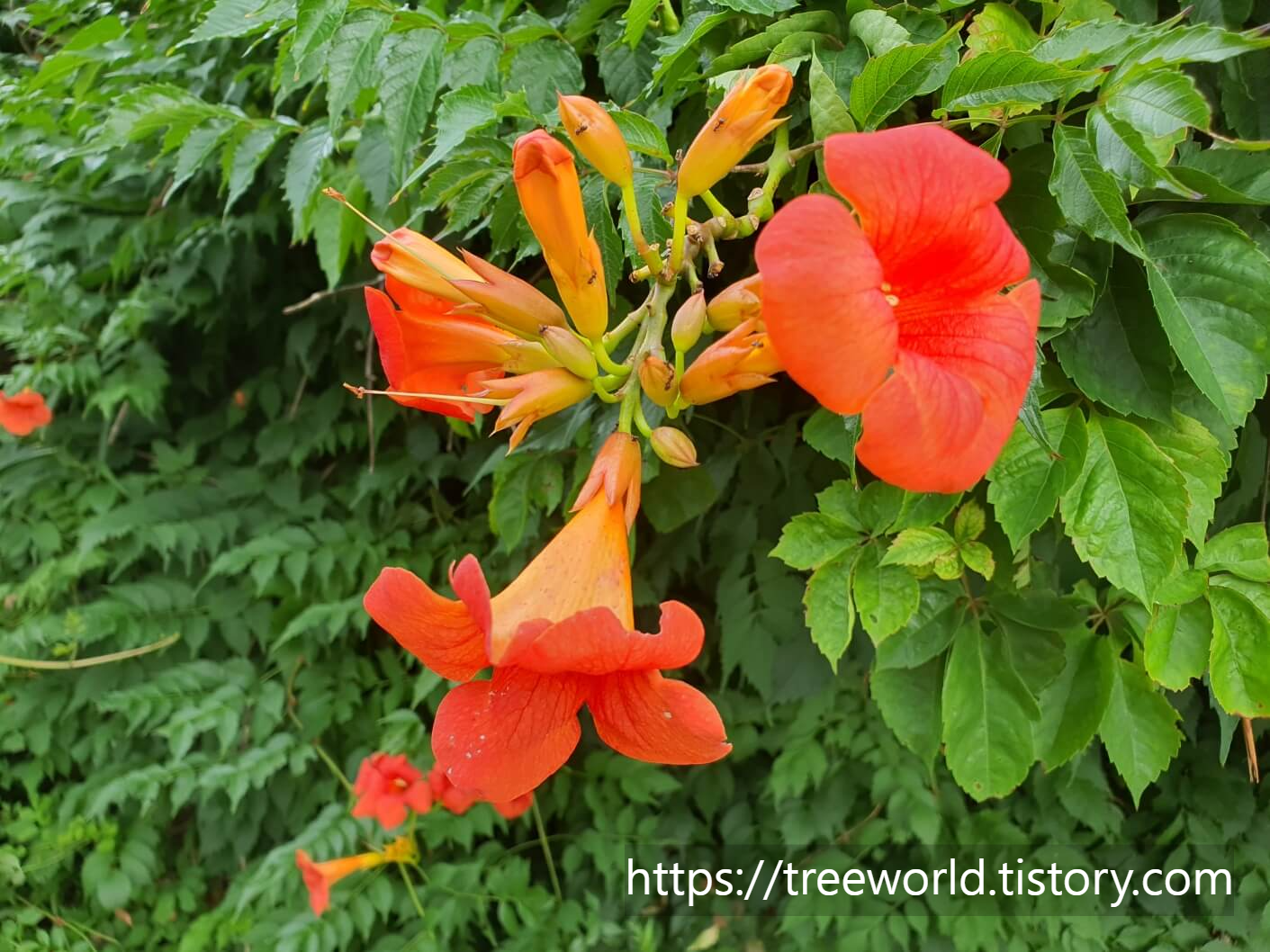 능소화의잎은 마주나고 홀수입니다. 작은 잎들이 달걀모양으로 7~9개 정도 붙어 있으며 크기는 5cm 정도 됩니다. 그리고 잎의 끝은 뾰족한 모양을 하고 있습니다. 잎의 가장자리에는 톱니와 더불어 털이 붙어 있습니다. 꽃은 여름철인 7~8월에 ㅇ피고 붉은빛을 띠는 짙은 황색이며 끝은 5개로 갈라집니다. 여름철 내내 꽃이 피고 지기를 반복합니다.