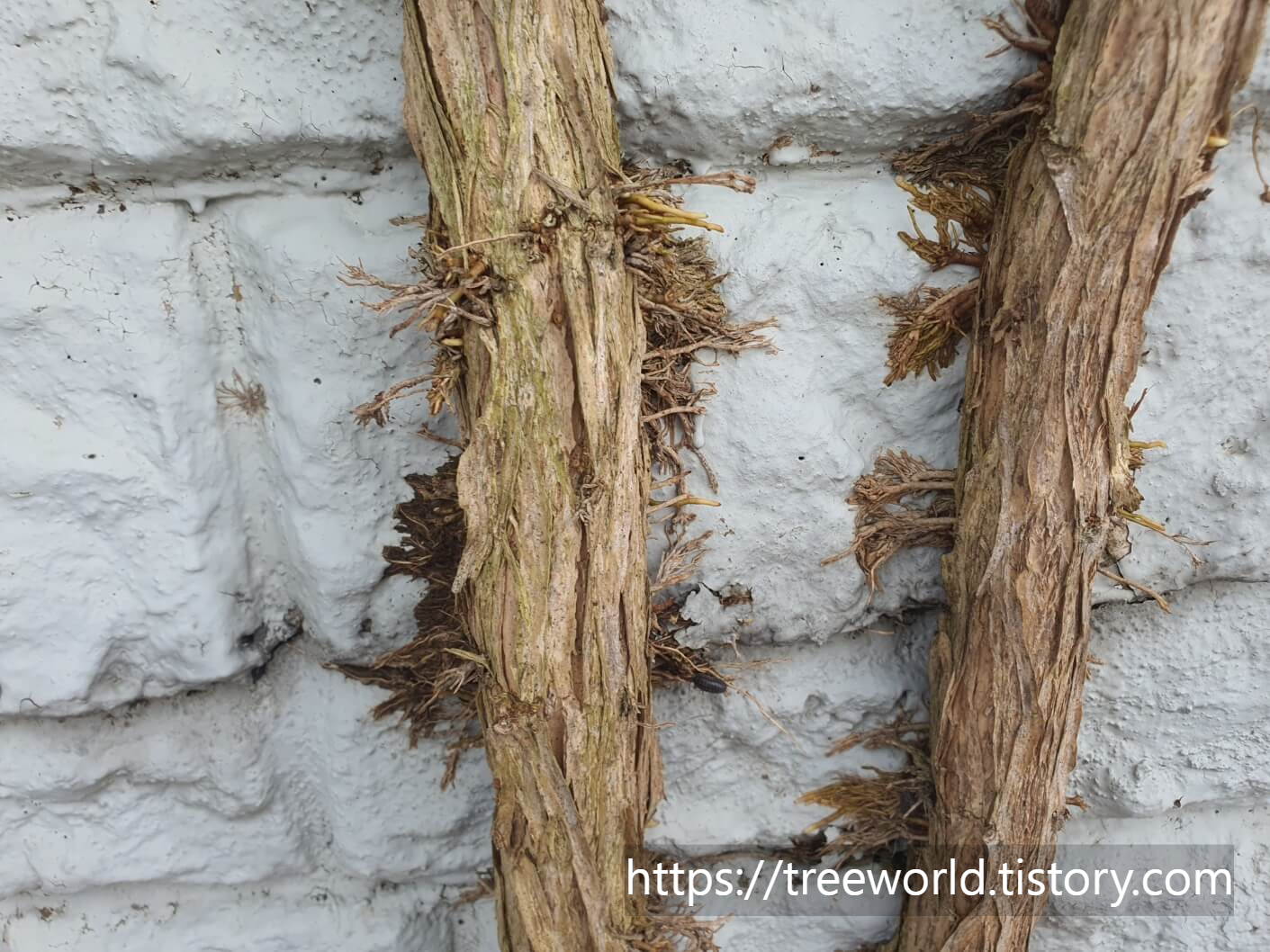 능소화의 줄기는 회색계통의 갈색이며 나무나 벽에 붙어 자랍니다. 그리고 줄기 마디마디 마다 흡착근이 나와 있어 지저분하게 자랍니다. 능소화 수목감별 포인트는 여름에 붉은 황색으로 피는 꽃과 벽이나 나무줄기에 붙어 자라는 덩굴식물의 줄기입니다. 반드시 흡착근이 있어 감별이 쉽습니다. 잎은 유사한 종이 많으니 예의 주시하여야 합니다.