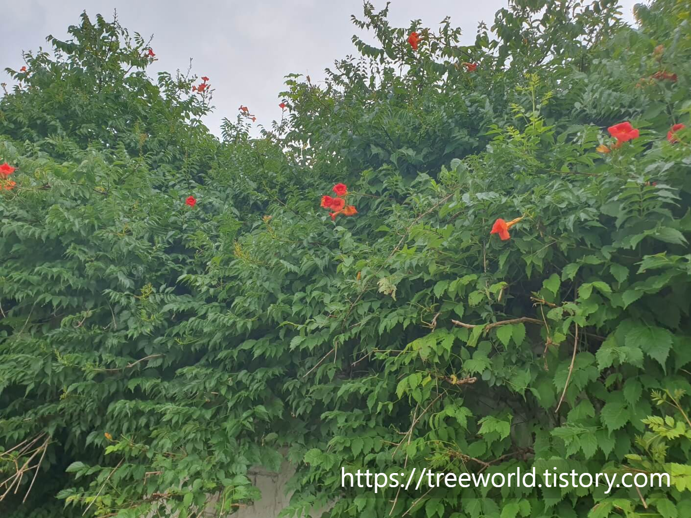나무의사의 수목감별법 중 오늘은 능소화에 대하여 소개해드리겠습니다. 능소화는 능소화과의 덩굴식물입니다. 벽이나 나무에 붙어서 자라고 길이는 10m까지 자라는데 마디의 중간마다 흡착근이 생겨 나와서 벽에 붙어 있습니다. 중국이 원산이며 옛날에는 양반집에만 심을 수 있는 금등화였습니다. 옛 문헌에는 능소화와 관련된 연서도 많이 공개되고 있습니다.