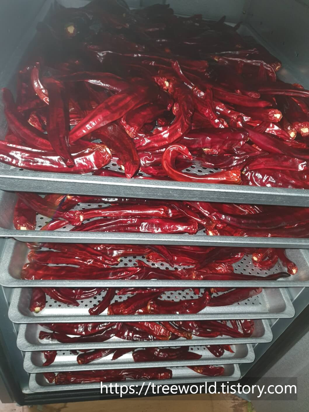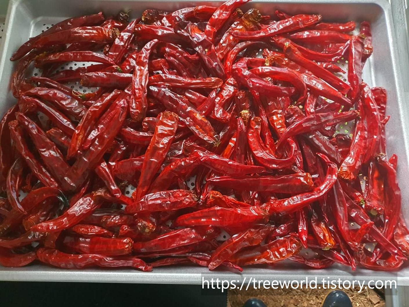 물론 쭈글쭈글하다고 해서 맛이 떨어지거나 하지는 않지만 상품성이 떨어집니다. 완전하게 익은 붉은고추를 따고 완전하게 시들 때까지 1일 이상 햇살에서 시들게 만들고 저온(약 42℃) 정도에서 2일 건조 후 고온으로 올리면 예쁜 붉은고추가 됩니다.