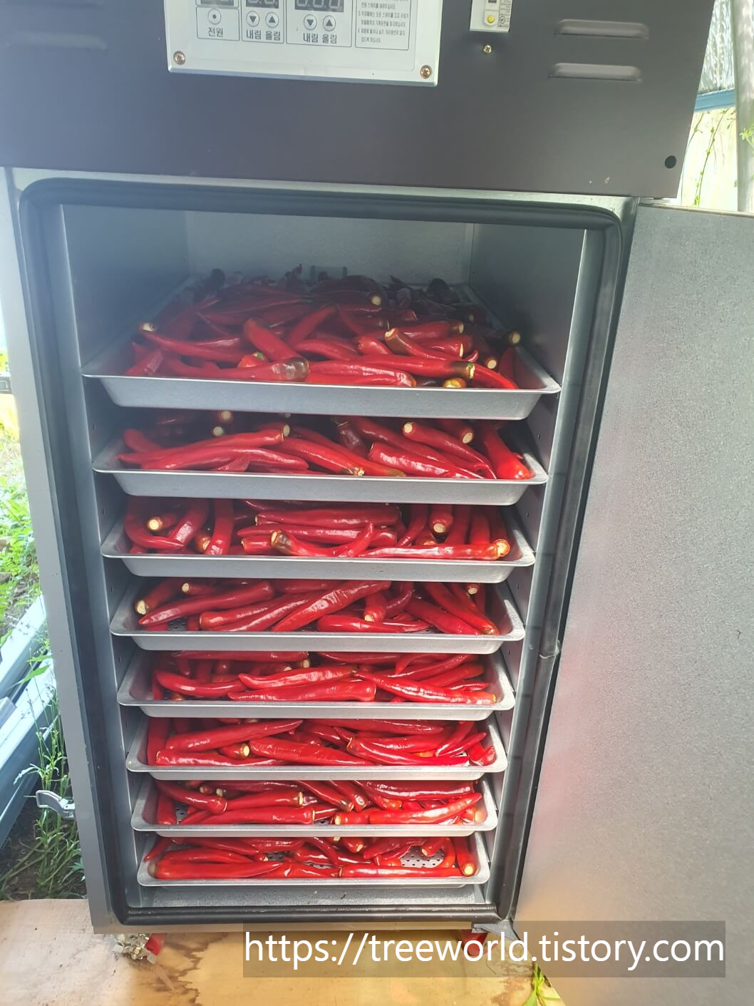 너무 고온으로 올리면 아래쪽에 있는 고추는 검게 타게 됩니다. 그래서 완전 고온은 장마기에 물에 젖은 고추 외에는 조심해야 합니다.