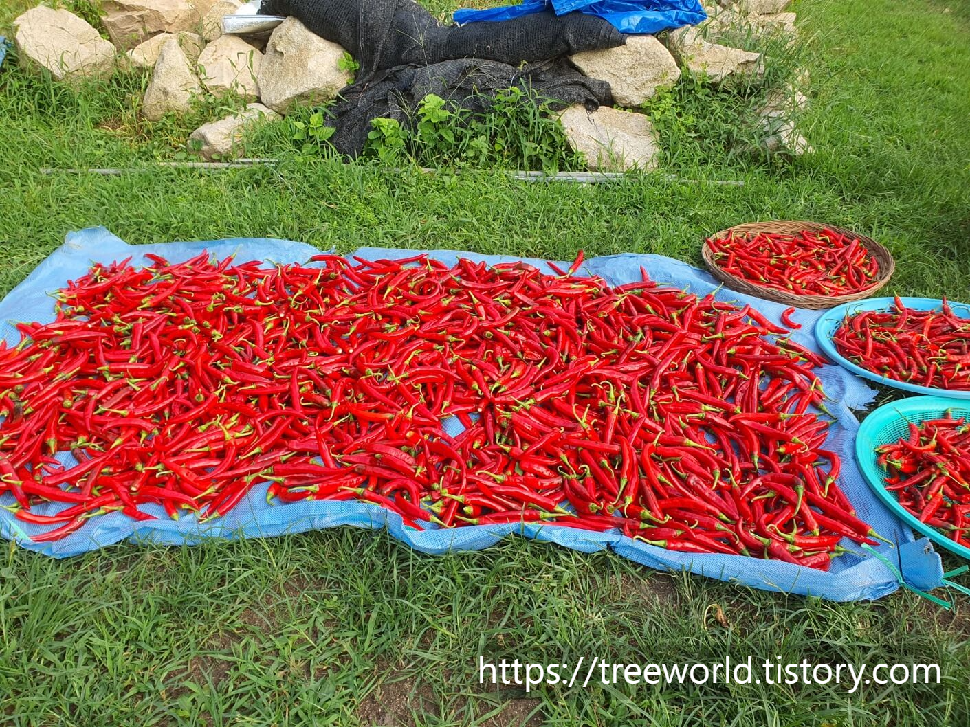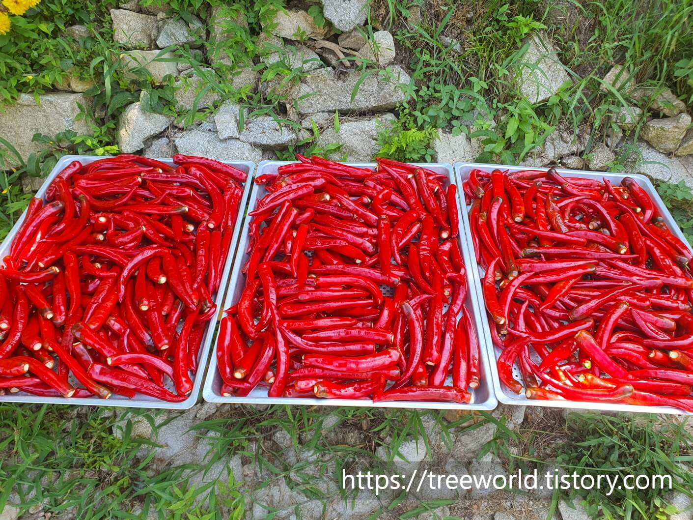 그러면 조금 덜 붉은색도 붉게 변하고 고추의 수분도 어느 정도 증발이 됩니다. 채취하여 세척한 붉은 고추는 꼭지를 따고 말려야 건조되는 속도가 빨라집니다.