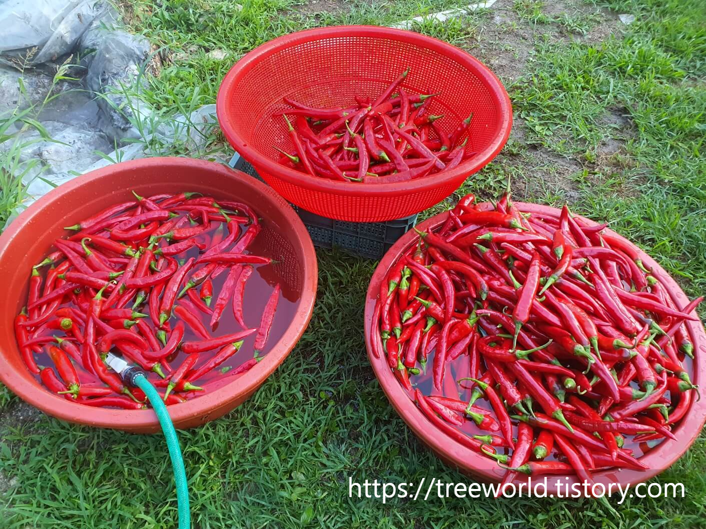 우선 붉게 익은 고추를 따야 하는데 대충 붉게 익은 고추는 따면 안 됩니다. 전체적으로 완전하게 붉게 익은 고추만 따야 합니다.