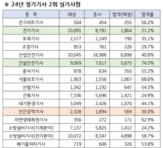 2024년 제2회 기사시험 최종 합격현황입니다. 기사시험은 종목마다 다르지만 통상 연 3회 실시됩니다. 2월에 1회, 6월에 2회, 10월에 3회 시험이 치러집니다. 응시 종목마다 합격률 또한 많이 다릅니다. 1차는 통상 30~50% 정도 되며 2차는 1차에 어렵게 출제된 종목은 쉽게 반대로 1차가 쉬웠던 종목은 어렵게 출제되고 합격률도 떨어집니다. 그래서 2차는 통상 30~60% 정도의 합격률이 됩니다. 이렇게 본다면 1차 응시자가 최종합격되는 확률은 20% 정도 된다고 보면 됩니다. 즉 100명이 응시하면 최종합격은 20명 정도 된다고 보시면 됩니다. 참고로 2회 시험 산림기사 최종합격률은 54.3%였습니다.