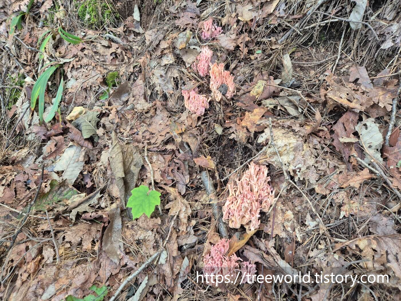 개울을 지나 산의 5~6부 능선부터 탐색을 하였습니다. 주말에 비가오고 기온이 많이 떨어져서 인지 뭔가 있을 것 같은 분위기는 좋았습니다. 또 몇 가지 잡버섯이 나와 있어 점점 더 기대를 갖게 되었습니다. 어느 정도 올라가자 좀 시기는 지났지만 싸리버섯이 보였고 노루궁둥이버섯도 보이고 여러 가지 잡버섯도 많이 보였습니다. 그러나 첫 번째 구광자리에서는 별다른 소득이 없었습니다.