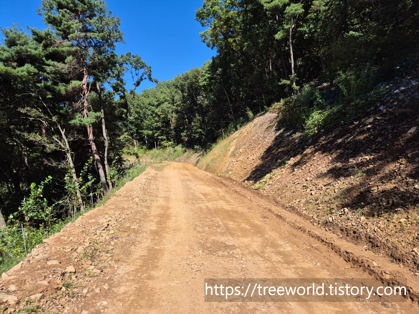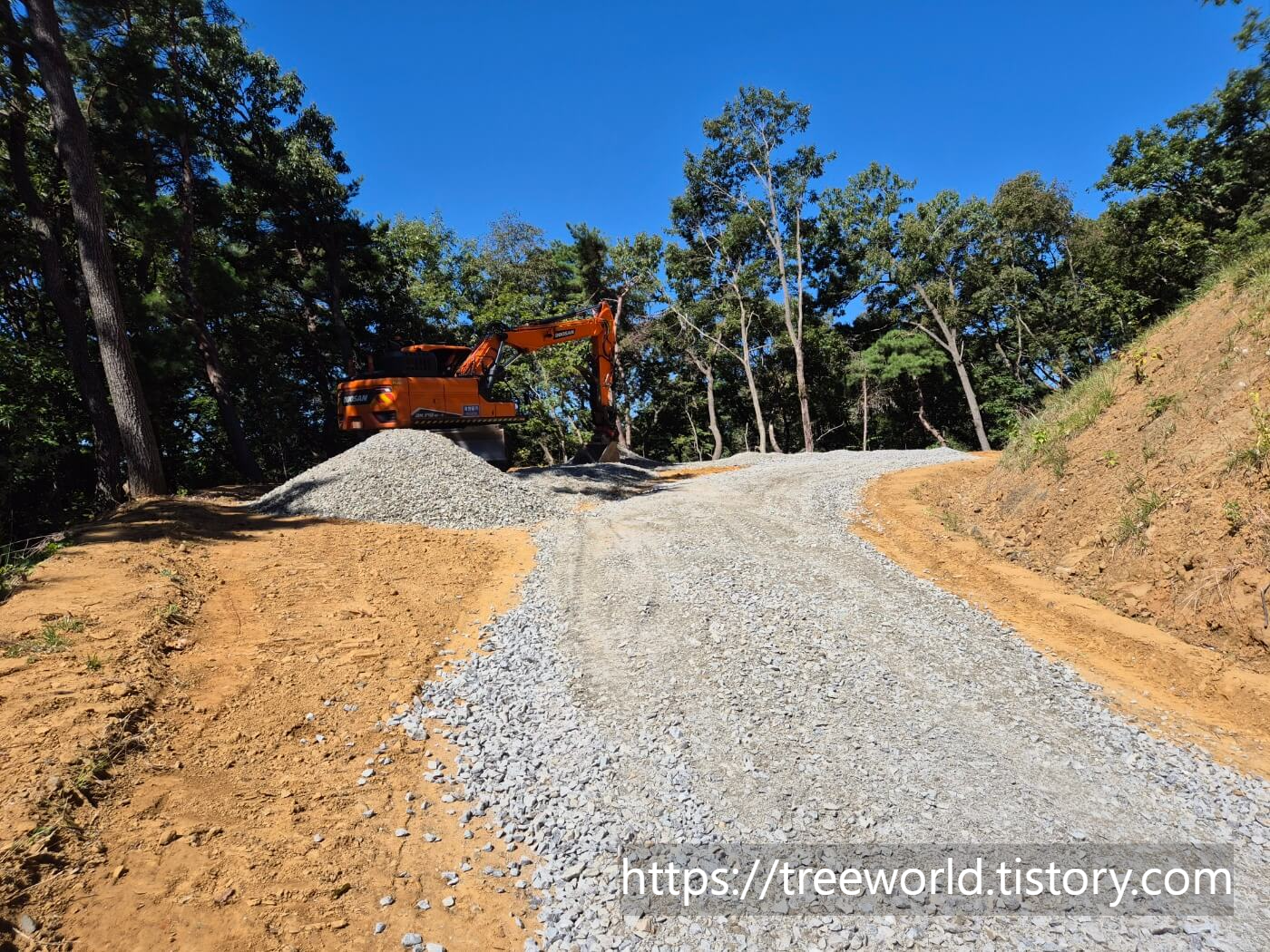 신설임도에 혼합석을 부설하는 방법은 작업 전에 임도 터파기를 실시합니다. 혼합석이 들어갈 자리를 굴삭기(6W)로 너비는 양쪽 길어깨 안쪽으로 깊이는 0.1m로 하여야 합니다. 이렇게 기초작업을 한 후 혼합석을 부설하면 길밖으로 혼합석이 나가지 않고 다져져서 자리를 잡습니다. 혼합석을 부설한 후에는 굴삭기 바퀴로 눌러서 다짐을 하기도 하지만 통상 롤러 다짐을 해야 골고루 안정적으로 다져집니다. 작업은 아주 건조한 날보다는 비 오고 1~2일 지나서 흙에 수분이 있을 때가 좋습니다.