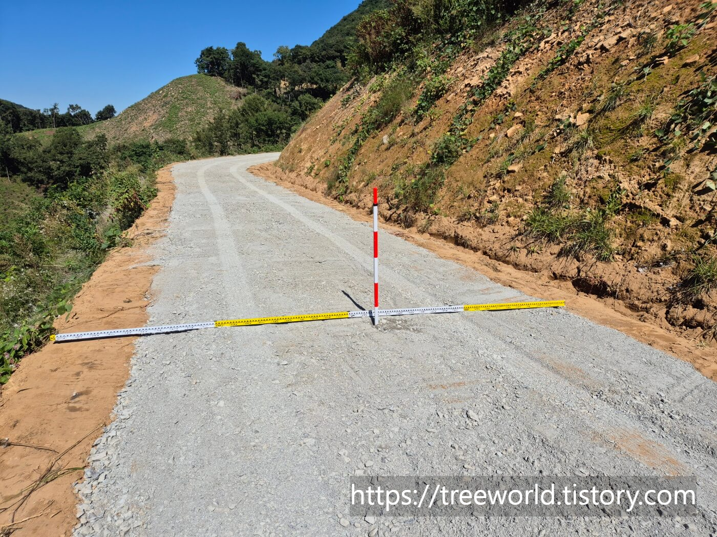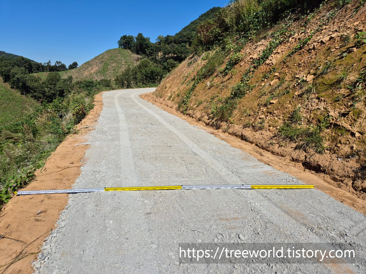 임도신설 혼합석 부설 개요입니다. 우리나라 임도는 산림 평균 1ha당 5~6m에 불과합니다. 1ha는 가로세로 100m 즉 10,000㎡를 말합니다. 그러니 얼마나 적은 것인지 알수 있습니다. 산불이 나면 진압을 위해 진입할 임도가 없고 임산물을 채집해도 운반할 방법이 거의 없는 수준입니다. 또 산에 벌목(개벌) 후 운재로로 사용되던 길도 임목운반이 끝나면 산사태나 홍수 때문에 다시 원상복구 해야 합니다. 그러다 보니 임도가 많지 않은 수준입니다. 임도를 신설하고 나면 유지보수를 쉽게 하고 임도의 기능을 오래 유지하기 위하여 실시하는 공정이 혼합설 부설입니다.
