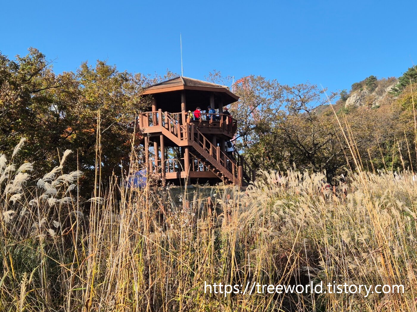 그리고 좀 걸었다고 생각되면 억새밭이 나오고 팔각정에서 커피 한잔 하며 조금 담소를 나누다 다시 1시간 정도 산 능선을 보며 아래쪽 골프장을 감상하며 걷다 보면 삼각봉 정상이 나옵니다.