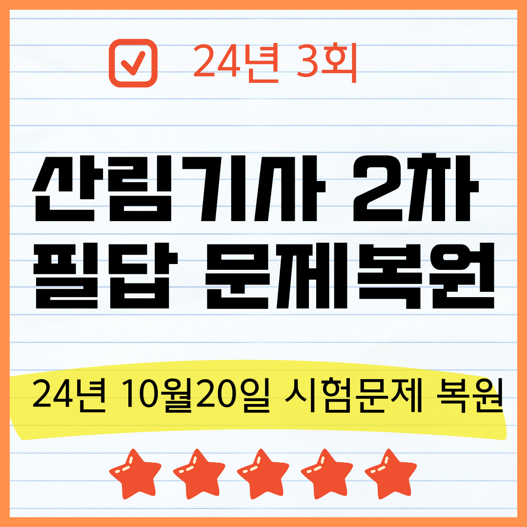2024년 산림기사 3회 시험 2차 필답문제는 최대한 복원을 하였습니다. 그러나 출제된 문제와 조금은 차이가 있을수 있다는 것을 염두에 두시기 바랍니다. 산림기사 2차 필답문제는 통상 15문항이 출제됩니다. 총배점은 60점이지만 문항마다 주어지는 점수는 차이가 있습니다.