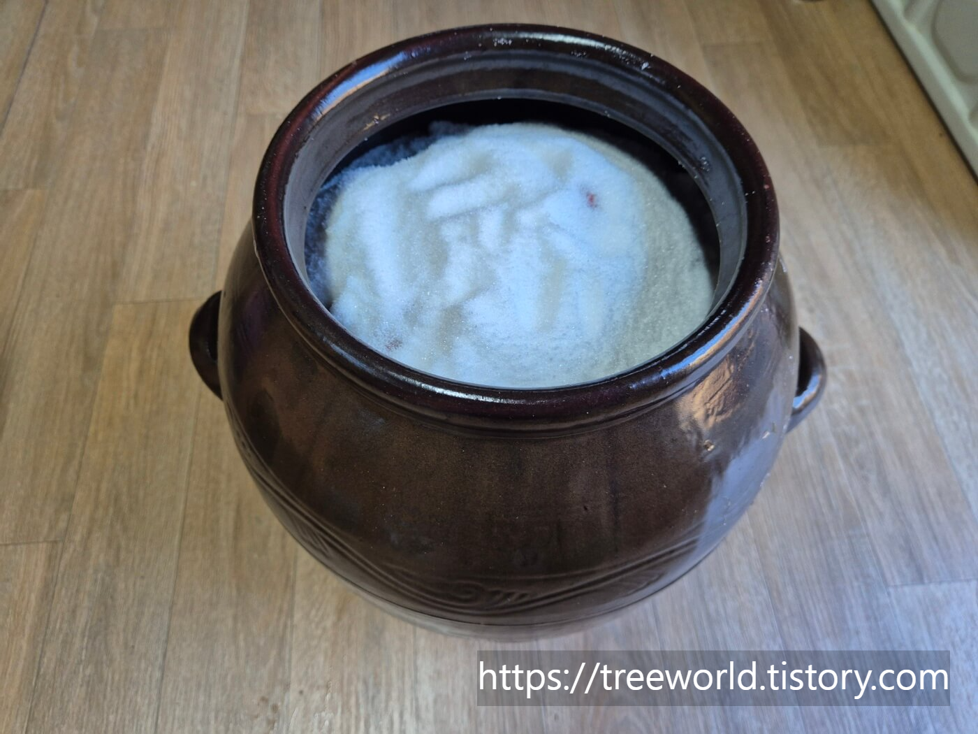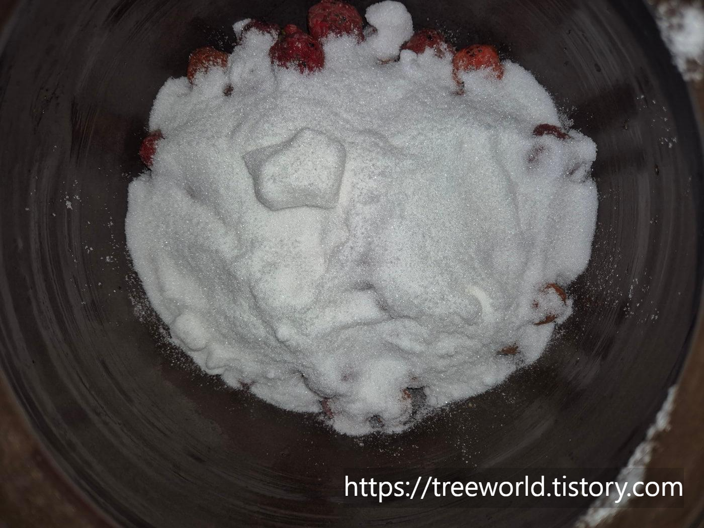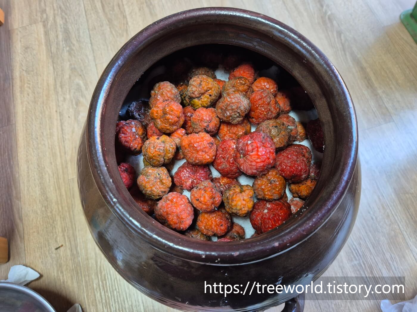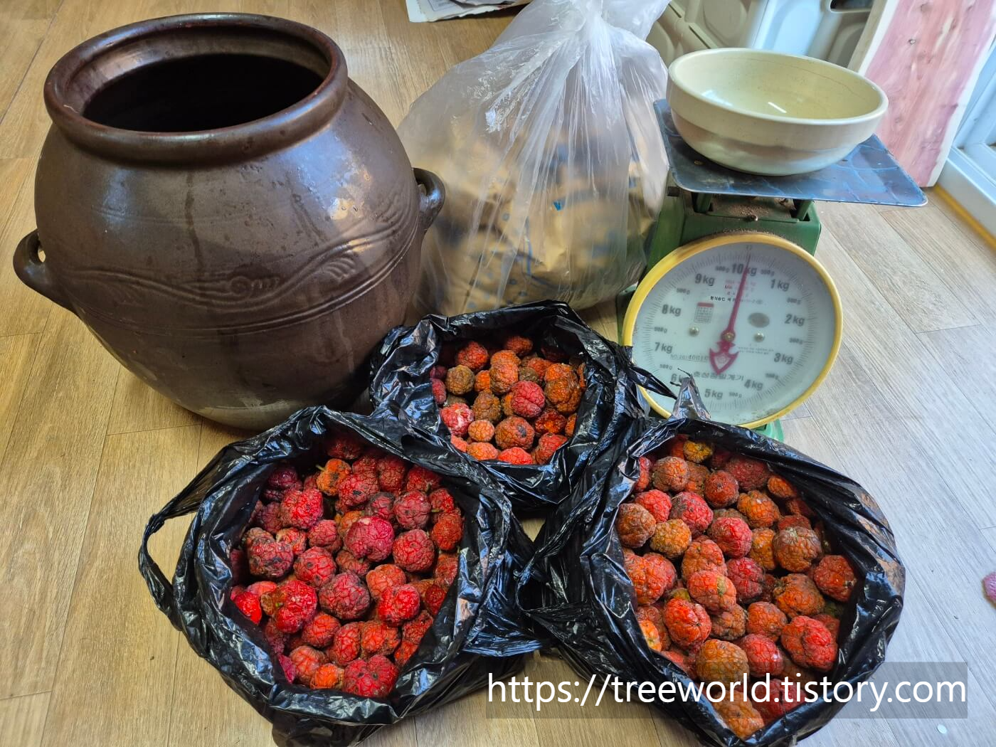 꾸지뽕액기스 담는 방법은 먼저 꾸지뽕열매를 따서 깨끗하게 닦고 건조하여야 합니다. 물에 씻으면 건조시간이 많이 걸리므로 깨끗한 면수건으로 닦는 것이 좋습니다. 그리고 설탕과 1:1의 비율로 섞어서 공기소통이 되는 단지나 액기스전용 용기에 담으면 됩니다 꾸지뽕나무는 가시가 많아 꾸지뽕열매를 따기가 그리 쉽지 않습니다. 또 꾸지뽕열매는 나무에서 잘 떨어지지 않습니다. 흔들어봐도 별로 떨어지지 않습니다. 서리가 오고 완전히 익으면 떨어지는데 그러면 물러져서 활용이 어렵습니다. 그래서 조심스럽게 따야 합니다 저는 꾸지뽕열매 6.5kg에 설탕 6kg을 넣었습니다. 꾸지뽕열매는 과즙이 많고 당도가 워낙 높아 설탕비율을 조금 줄여 보았습니다.