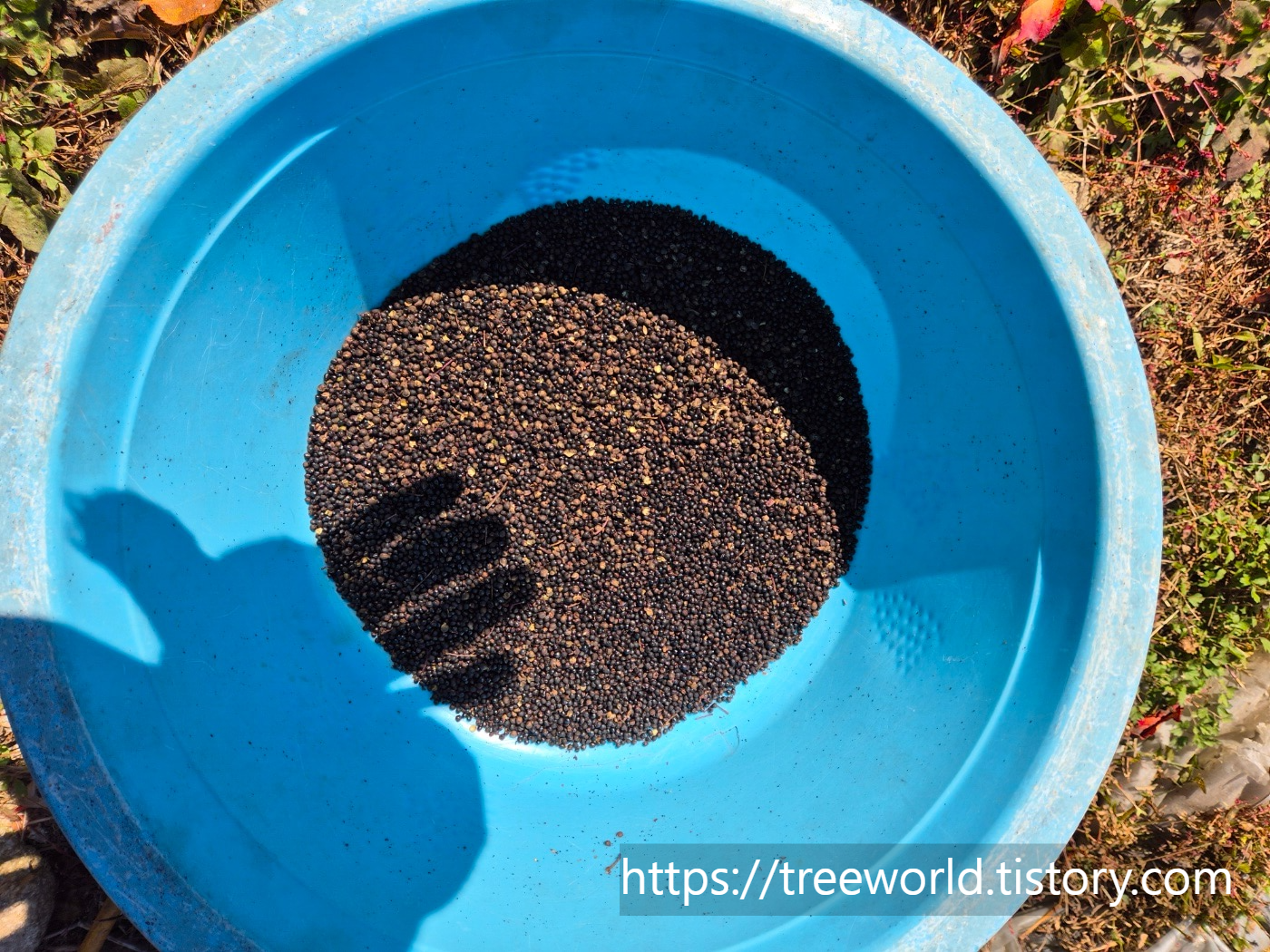나무에 달려 있는 산초열매 꼬투리를 따오면 2주일 정도 햇볕에 말려야 합니다. 그러면 산초열매 꼬투리의 작은 껍질들이 말라서 갈라집니다. 갈라진 산초열매 껍질안에 검은색 산초알갱이가 있습니다. 햇볕에 바싹 마른 산초열매 꼬투리를 나무로 두들기거나 손바닥으로 비비면 검은색 열매와 껍질이 분리가 됩니다. 양이 많은 경우는 도리깨를 사용하는 것이 효과적입니다. 그러나 이번에는 산초수확량이 적어서 막대기로 두들겨서 산초열매껍질과 알갱이를 분리하였습니다.