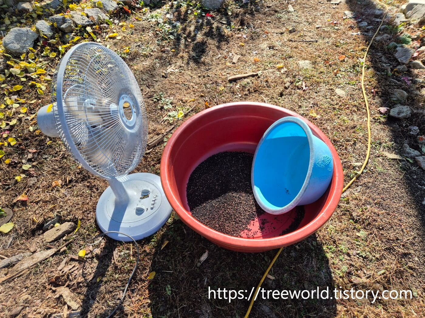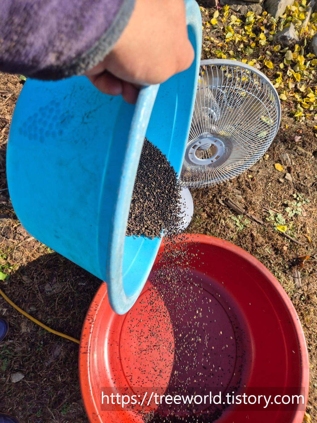 산초열매껍질과 알갱이 분리하는 방법은 간단합니다. 막대기나 손으로 비벼서 껍질과 알갱이가 분리되었다면 껍질은 버리고 알갱이만 수확해야 합니다. 이럴 때 가장 유용한 방법이 선풍기 바람을 이용하는 방법입니다. 옛날에는 풍구라고 하여 손으로 돌리면 바람이 발생하는 기계가 있었습니다. 그러나 지금은 바람이 많이 부는 날은 바람을 이용하면 되지만 그렇기 않으면 선풍기 바람을 이용하여 껍질은 가벼우니 날려 보내고 알갱이는 무게가 있으나 바로 떨어지게 되는 방법을 사용하는 것이 효율적입니다. 분리된 알갱이로 산초기름을 짜면 됩니다.
