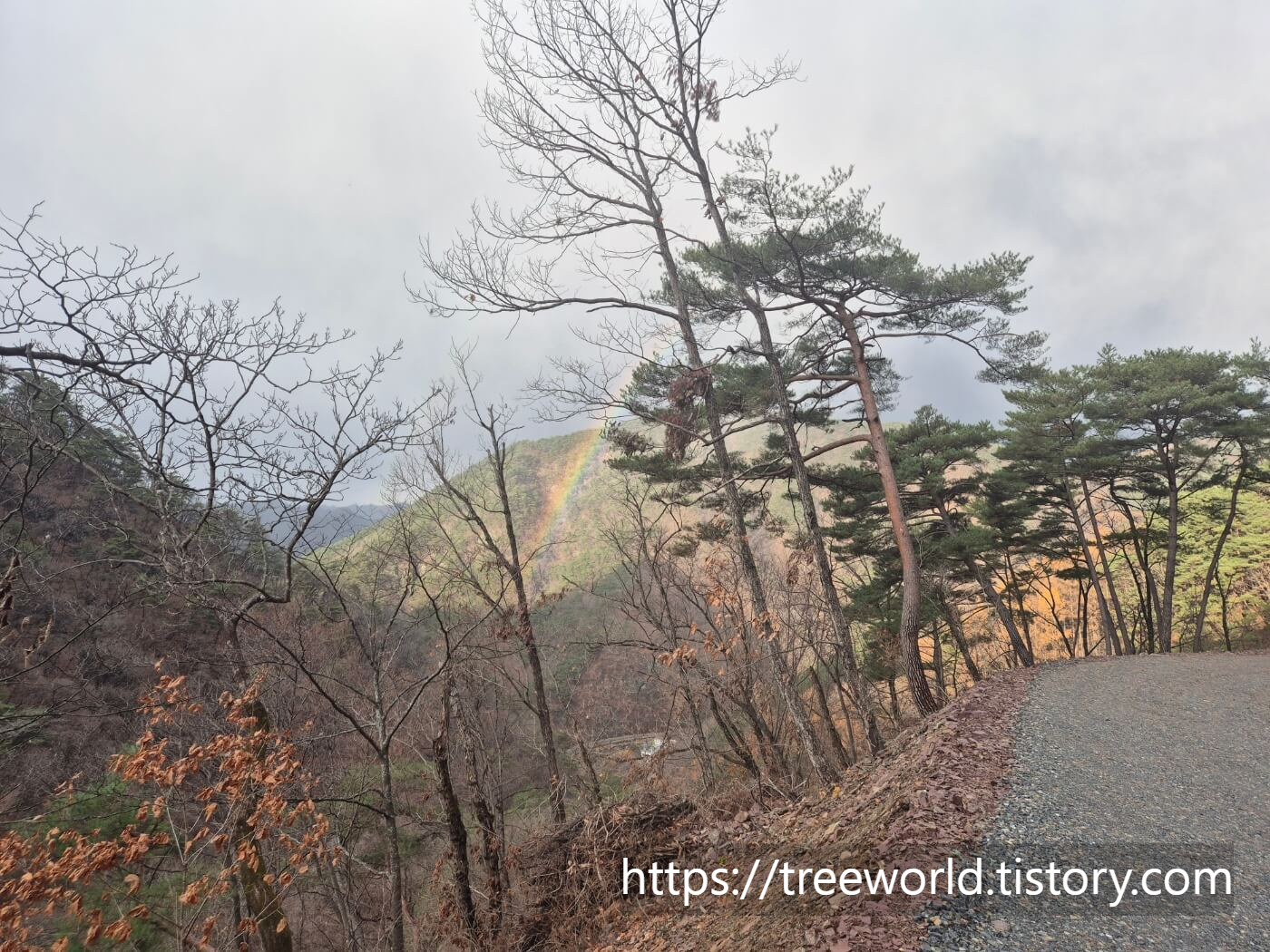 늦가을 풍경을 구경하면서 현장에 도착하여 산속 임도를 올랐습니다. 비가 오더니 갑자기 날씨가 맑아졌습니다. 그런데 눈앞에 멋진 무지개가 나타났습니다. 그것도 바로 눈앞에 발아래에 나타난 것은 처음입니다. 이런저런 구경도 하고 산촌 마을도 구경하고 일을 하면서 나름대로의 낭만을 만끽한 하루였습니다.