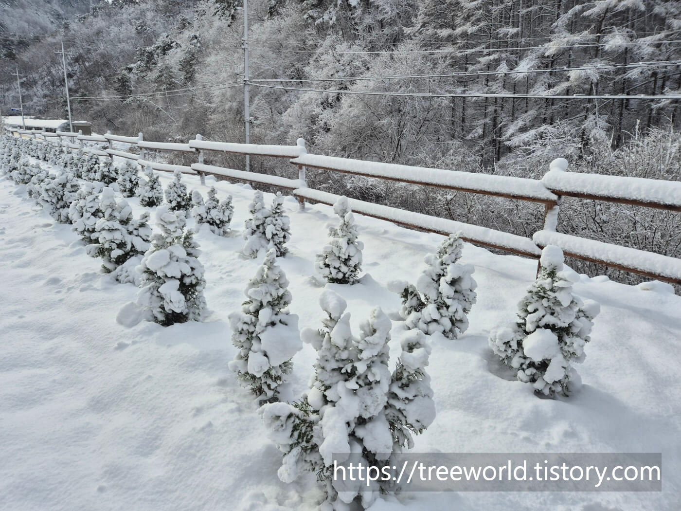 2024년 11월 27일 올해 강원도에도 첫눈이 내렸습니다. 첫눈치고는 너무 많이 내렸습니다. 15cm가 넘게 내렸는데 지금도 간간이 오고 있습니다. 소나무와 같은 상록 침엽수들은 지금 같은 섭설이 내리면 가지가 쉽게 찢어지고 또 나무전체가 부러지기도 합니다. 낙엽 활엽수들은 앙상한 가지에 소담스럽게 눈이 쌓여 멋진 설경을 만들어 냅니다.
