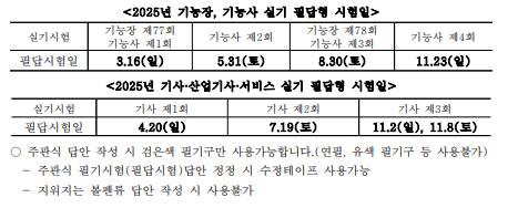2025년 국가기술자격시험 2차 필답시험 및 주관식 필기로 시행하는 실기시험은 시험이 시작되는 첫 번째 토요일 또는 일요일에 전국 동시 시행 됩니다. 국가기술자격검정 종목별 시행회 관련 세부사항은 한국산업인력공단 홈페이지에 세부적으로 공고되어있습니다.( www.Q-net.or.kr )