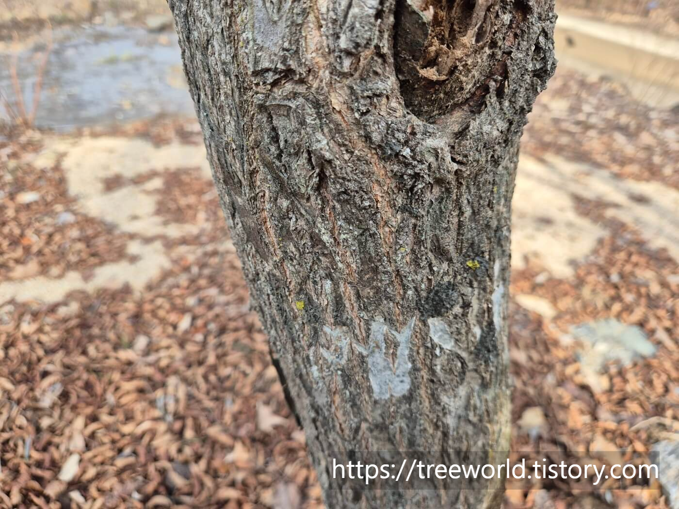 까치박달의 수피는 검은색을 띠는 회색으로 얼릴 때는 수피에 물푸레나무처럼 흰색 얼룩이 생기는 경우도 있습니다. 수피는 작은 껍질이 붙어 있으며 매우 단단해 보입니다. 수목감별 포인트는 다른 서어나무속의 개서어나무, 소사나무, 서어나무등과 다르게 잎에 정갈하게 잎맥이 있으며 열매도 깨끗한 모습으로 아래를 향해 붙어 있습니다.