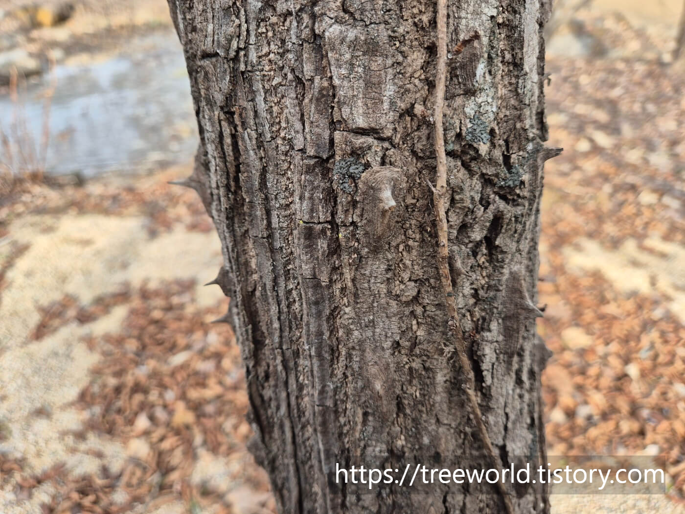 음나무의 수피에는 가시가 많이 나 있으며 진한 회색 입니다. 오래된 줄기는 진한 갈색으로 변하며 가시가 줄어듭니다. 음나무 한 곳에 군집하여 자라지 않고 독립수로 자랍니다. 수목감별 포인트는 손바닥 모양의 잎과 가지에 있는 가시입니다. 그리고 어린순은 다 자란 잎과 차이가 많으므로 잘 보아야 합니다. 단풍나무 중 고로쇠나무잎과 매우 유사하므로 잎과 가시로 감별하여야 합니다.