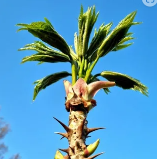 음나무의 잎은 손바닥모양으로 5~7개로 갈라져 있으며 크기는 어른손바닥정도 입니다. 꽃은 방사형으로 여러 개가 피며 줄기에는 가시가 크게 자라 함부로 접근이 어렵습니다. 어린 가지에는 가시가 많으나 오래된 가지는 가시가 없어 기는 경우도 있습니다.