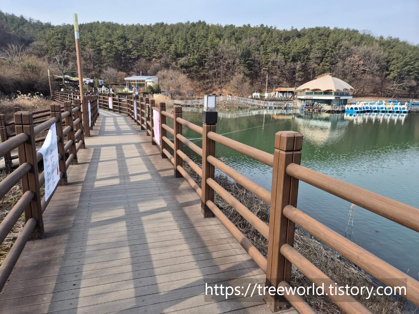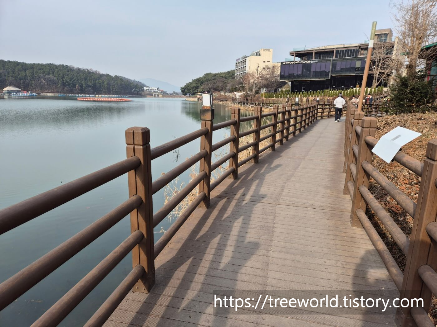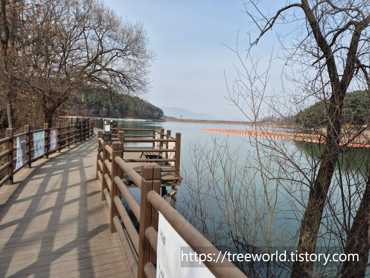 저수지 주변으로 산책로가 약 2.6km가 데크와 야자메트길로 연결이 되어 있습니다. 천천히 걸어서 1시간 빨리 걸으면 40분 정도 소요됩니다.