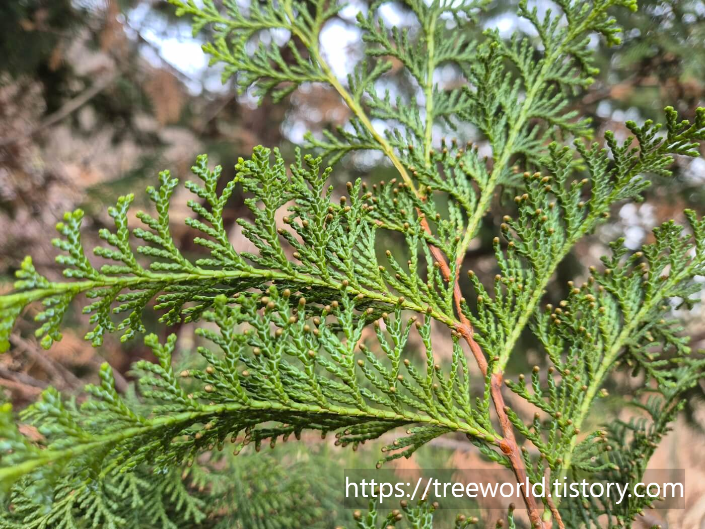 편백의 수피는 적갈색이며 세로로 갈라져 있습니다. 잔가지는 수평으로 자라며 원산지는 일본입니다. 실생 및 삽목으로 번식합니다.