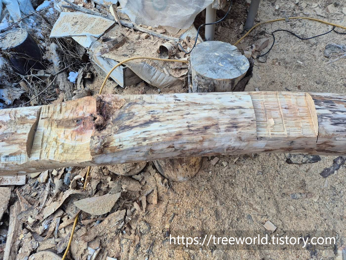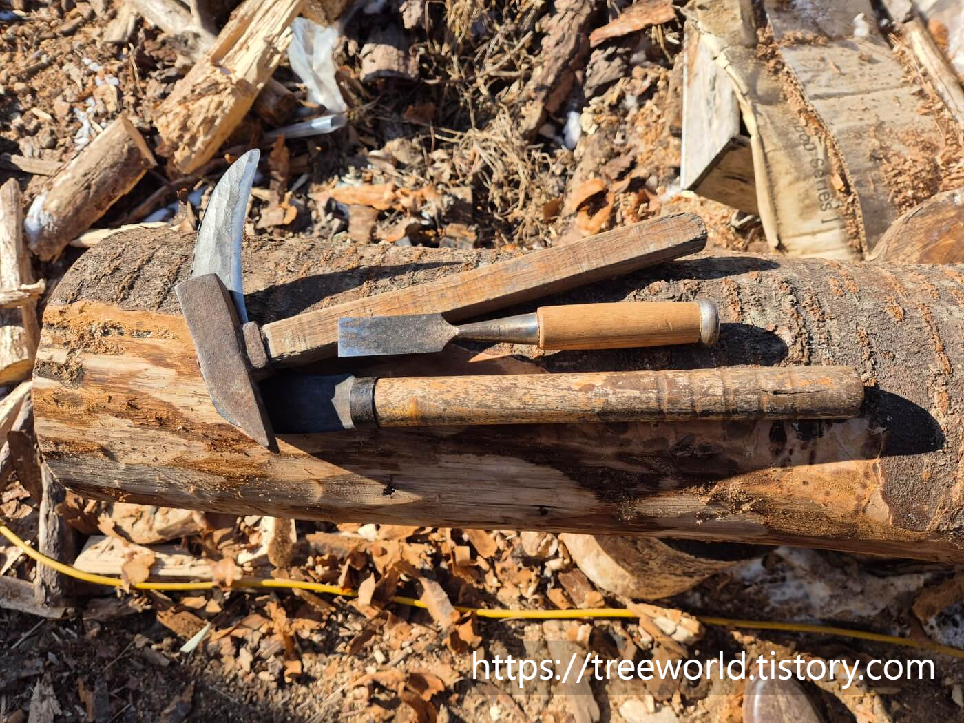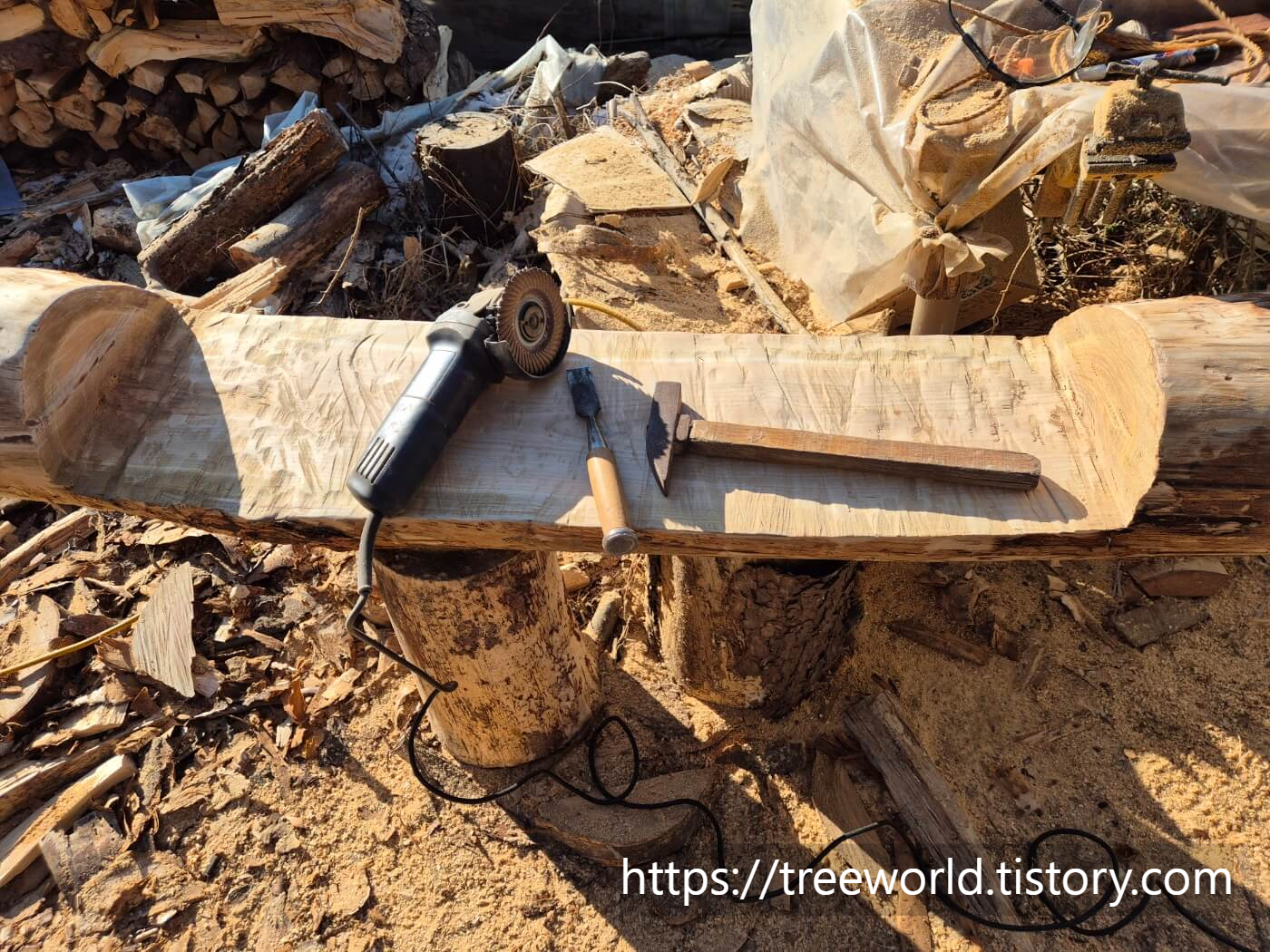 건조된 나무는 껍질이 제거되어 있으면 그냥 사용이 가능하고 껍질이 제거되어 있지 않으면 우선적으로 껍질을 제거하여야 합니다. 그리고 나무에 개략설계를 하고 엔진톱으로 기본형태를 만들어야 합니다.
