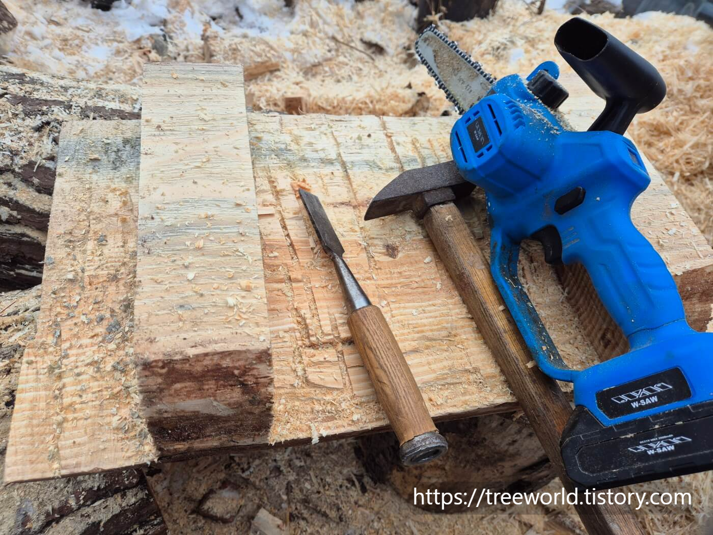 다리를 만들 때는 큰 엔진톱으로 기초작업을 하고 세밀한 부분은 작은 전기 엔진톱으로 하면 작업이 쉽습니다.