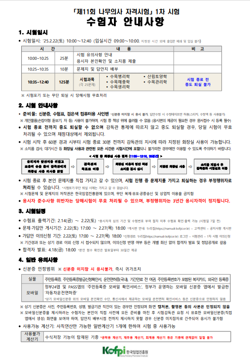나무의사 시험이 2025년 부터일부가 변경되었으니 수험자 안내사항을 숙지하시어 실수가 없어시기를 바랍니다. 위의표는 임업진흥원의 수험자 안내사항을 게시하니 참고 바랍니다. 5개 과목을 동시에 125분간 시험을 치러지니 특히 시간안배를 잘하지 못하면 후반부에 보는 과목은 시간이 없어 낙제될 수 있습니다.