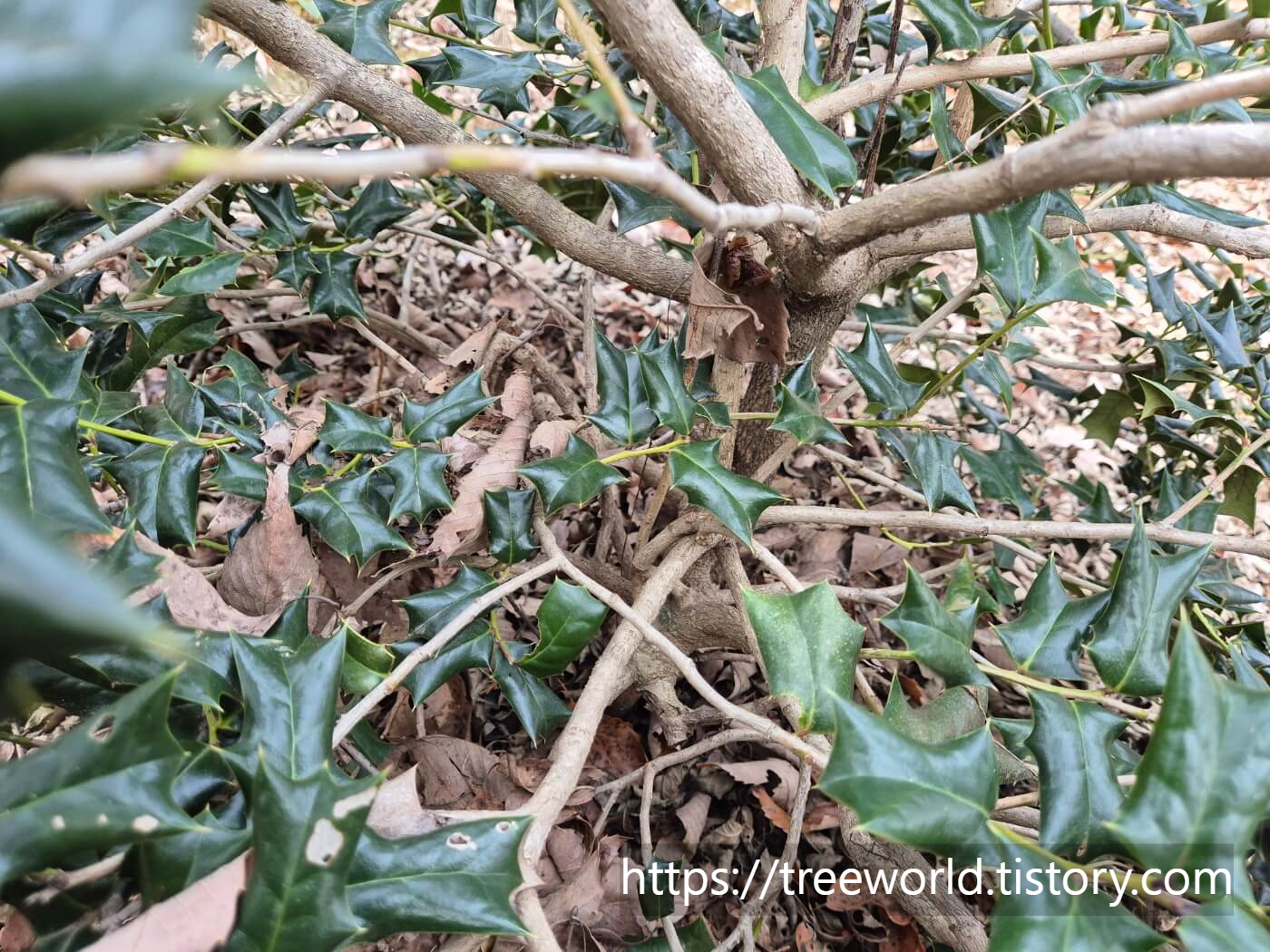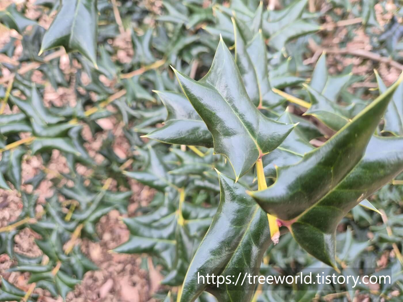호랑가시나무의 잎은 윤기가 많이나고 두터운 특징도 있습니다. 그리고 관목과 소교목의 중간정도로 수고가 높지 않고 어린가 지는 연녹색이고 오래된가 지는 회색입니다.