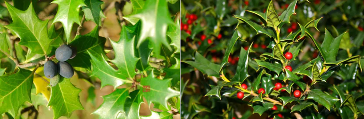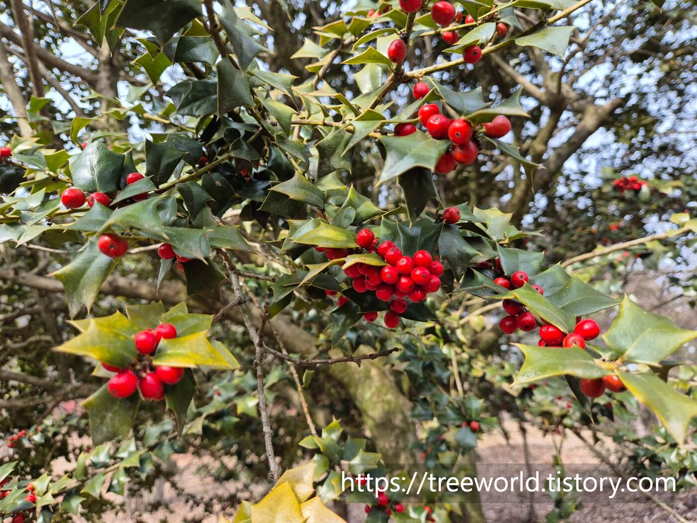 호랑가시나무는 크리스마스트리로도 많이 사용됩니다. 그리고 호랑가시나무의 빨간색 열매는 구골나무와 구별할 수 있는 유일한 포인트입니다. 호랑가시나무와 유사한 구골나무는 검은색 열매가 달립니다.