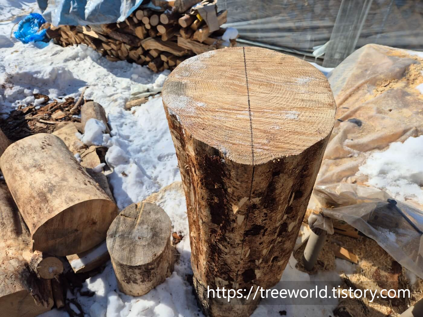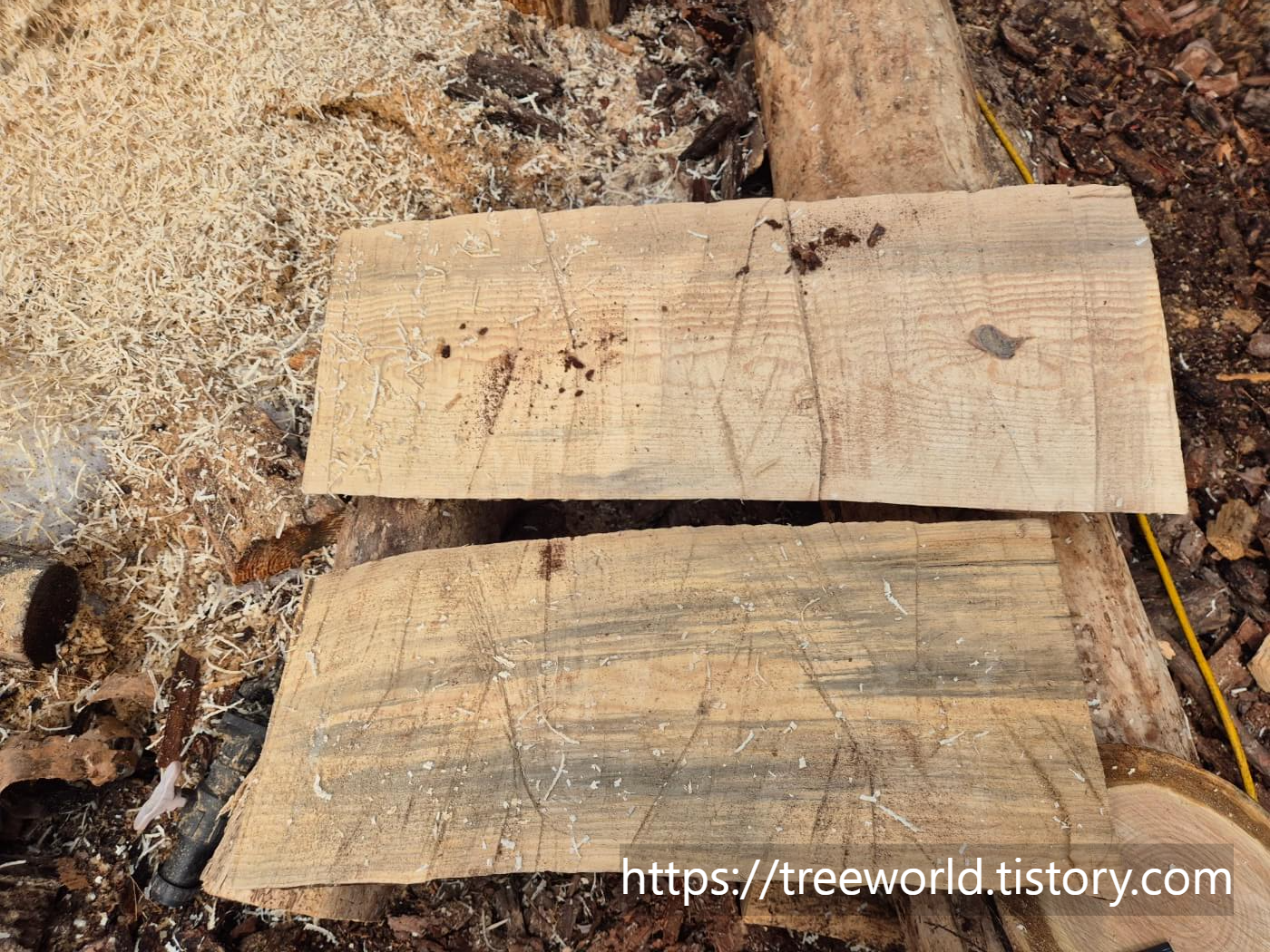 저는 엔진톱으로 원하는 두께인 8cm와 길이 80cm로 잘랐습니다. 너비는 나무의 껍질제거후 변재부위 일부는 제거한 상태로 대패로 밀어서 목재로 만들었습니다. 원목은 내부상태를 잘 보고 켜야 합니다. 가급적 옹이는 살려서 무늬로 사용하는 것이 좋습니다.