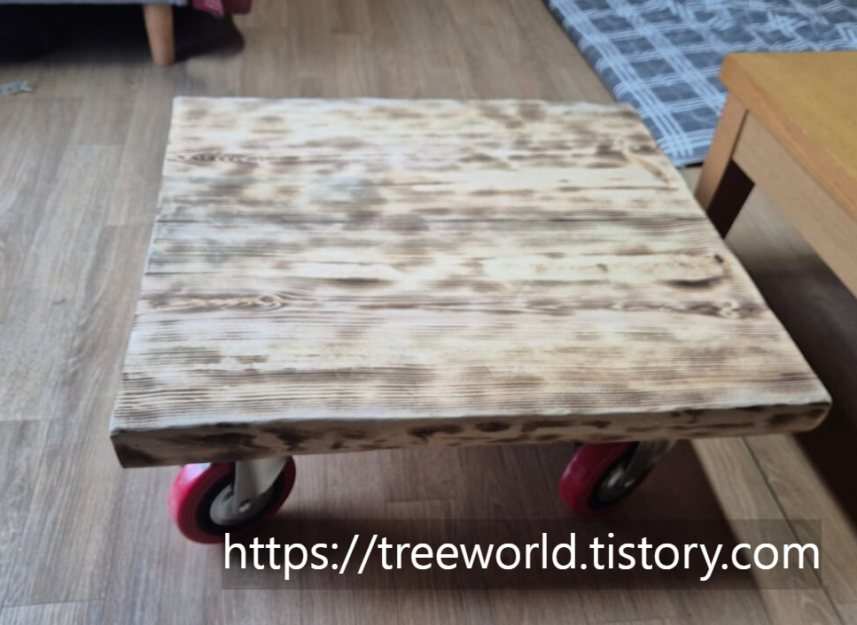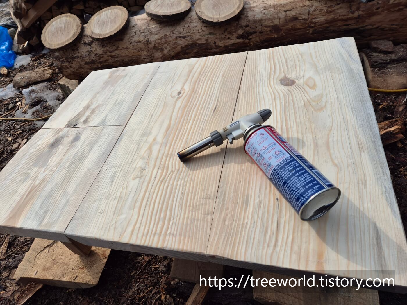 상판은 곰팡이나 소나무좀 유충들이 나무속에 있을수 있어 토치로 태웠습니다.