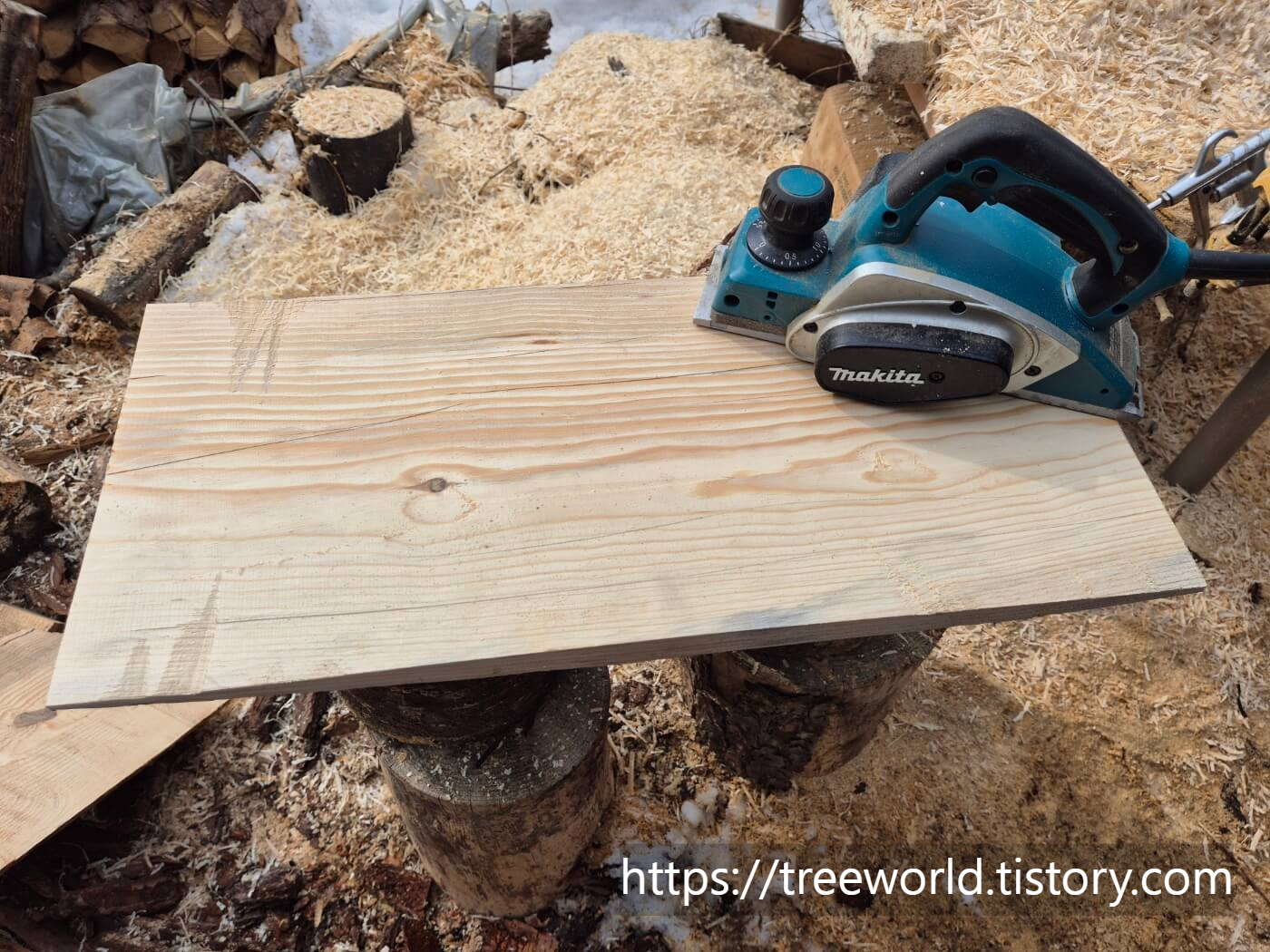 엔진톱으로 자른 목재는 전동대패로 밀고 다음은 그라인더 목공날로 세밀하게 균형을 잡아야 합니다. 전동대패로 밀때는 처음에는 거칠게 1.0mm로 하고 마지막은 0.2~3mm로 작업하면 됩니다.