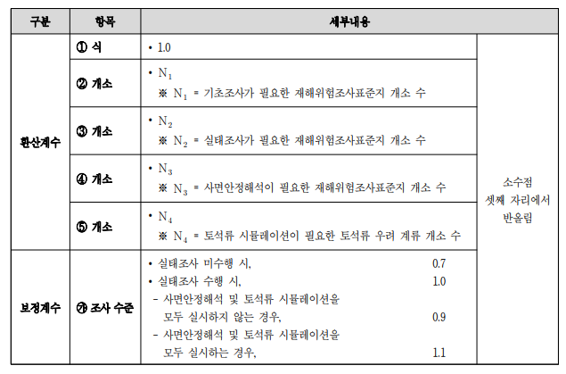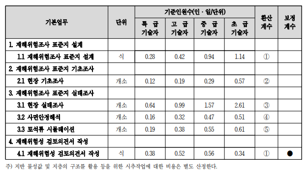 이로 인해 재해위험성 검토의견서 작성을 위한 업무의 단계를 구분하고 각 단계별 수행업무에 따른 기술인력 등급별 투입인원환산과 업무난이도에 따른 보정계수를 결정하여 새로운 재해위험성 검토의견서 작성 표준품셈표가 만들어졌습니다.