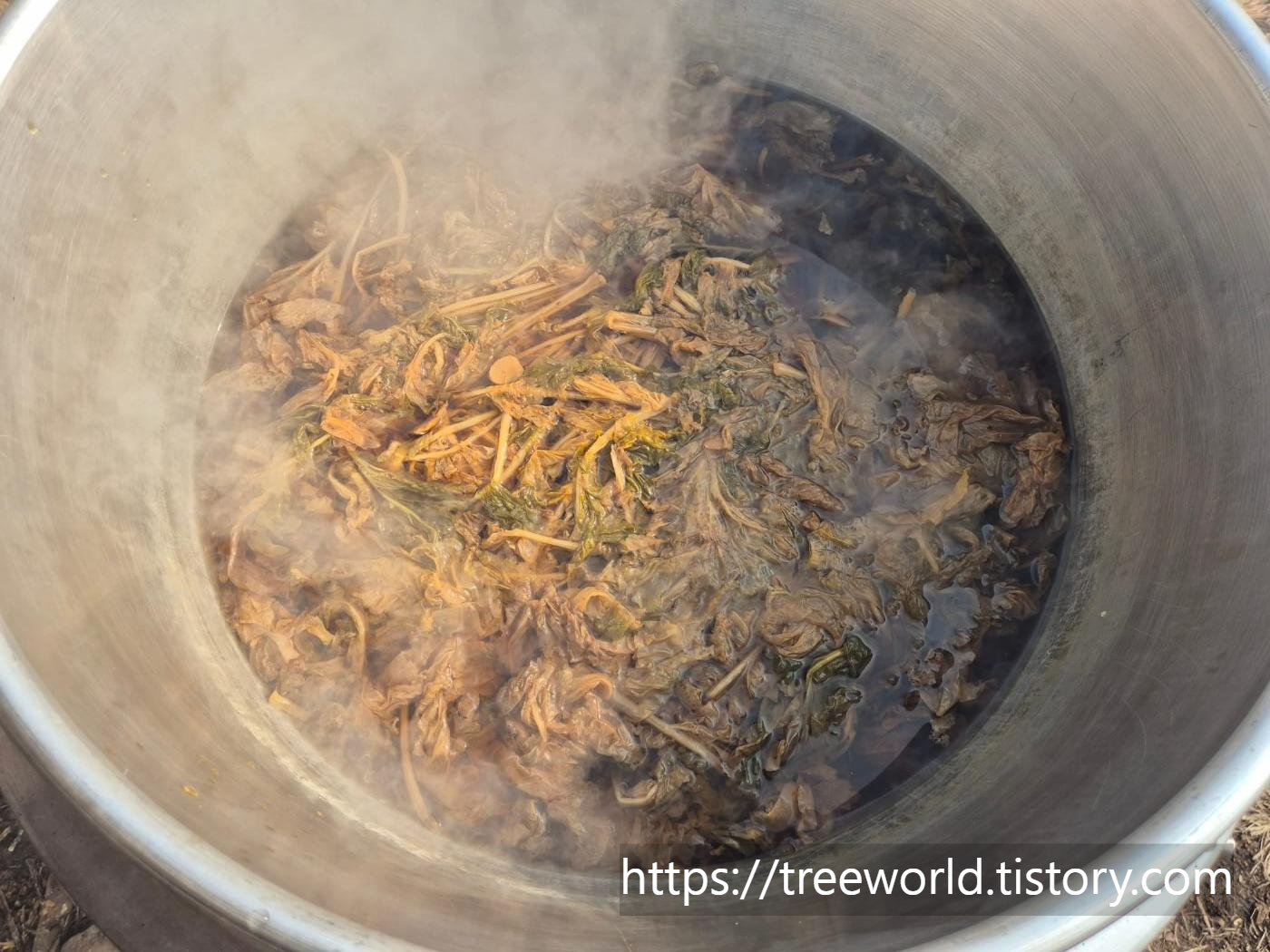 삶을 때는 시간이 중요합니다. 무청시래기는 건조되어 있었기 때문에 물을 충분히 넣고 약한 불에 30분 정도 끓이다가 센 불로 1~2시간 정도 삶으면 됩니다.