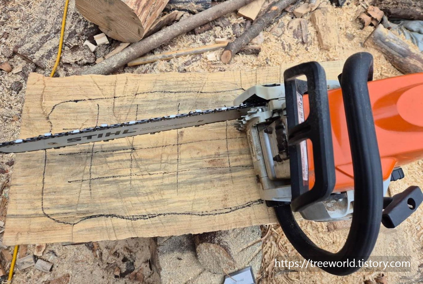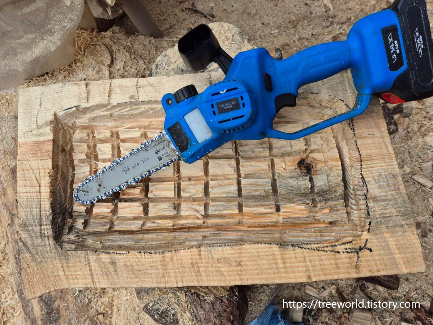 깊이는 15cm 정도 되게 하는데 처음에는 큰 엔진톱으로 하다 중간 이후부터 전기톱으로 세부작업은 진행하였습니다 기본적인 작업이 완료되면 마무리 작업을 하면 됩니다.
