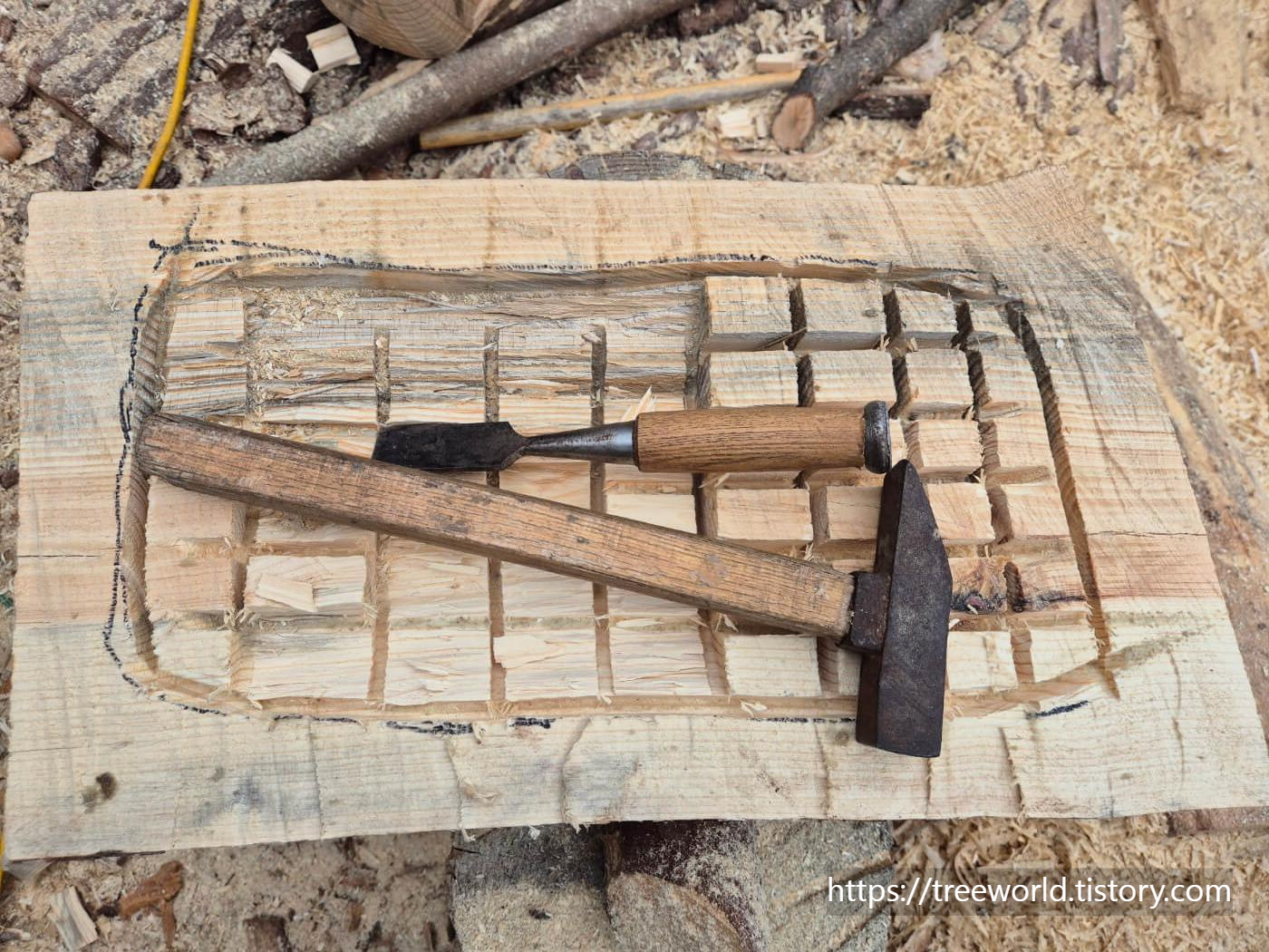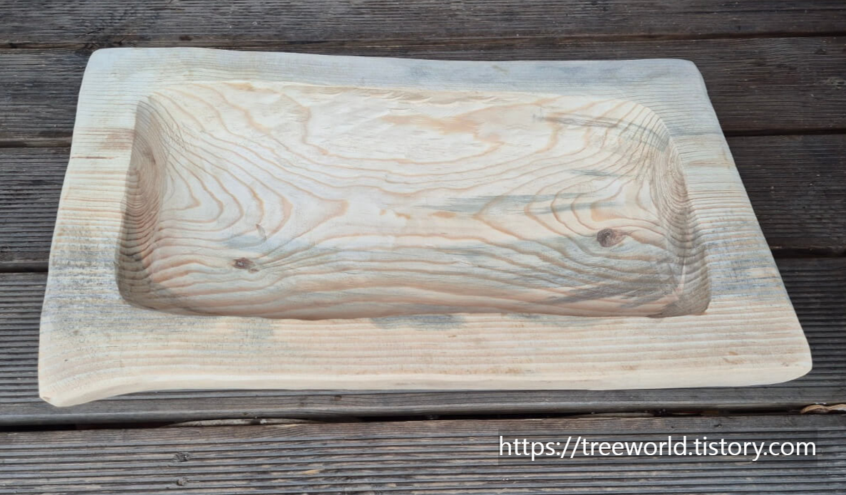 개략적으로 소나무 원목 재단을 한다음 끌과 망치로 내용물을 파냈습니다. 구유내부는 가로 50cm, 세로 25cm 정도가 되게 작업을 했습니다.